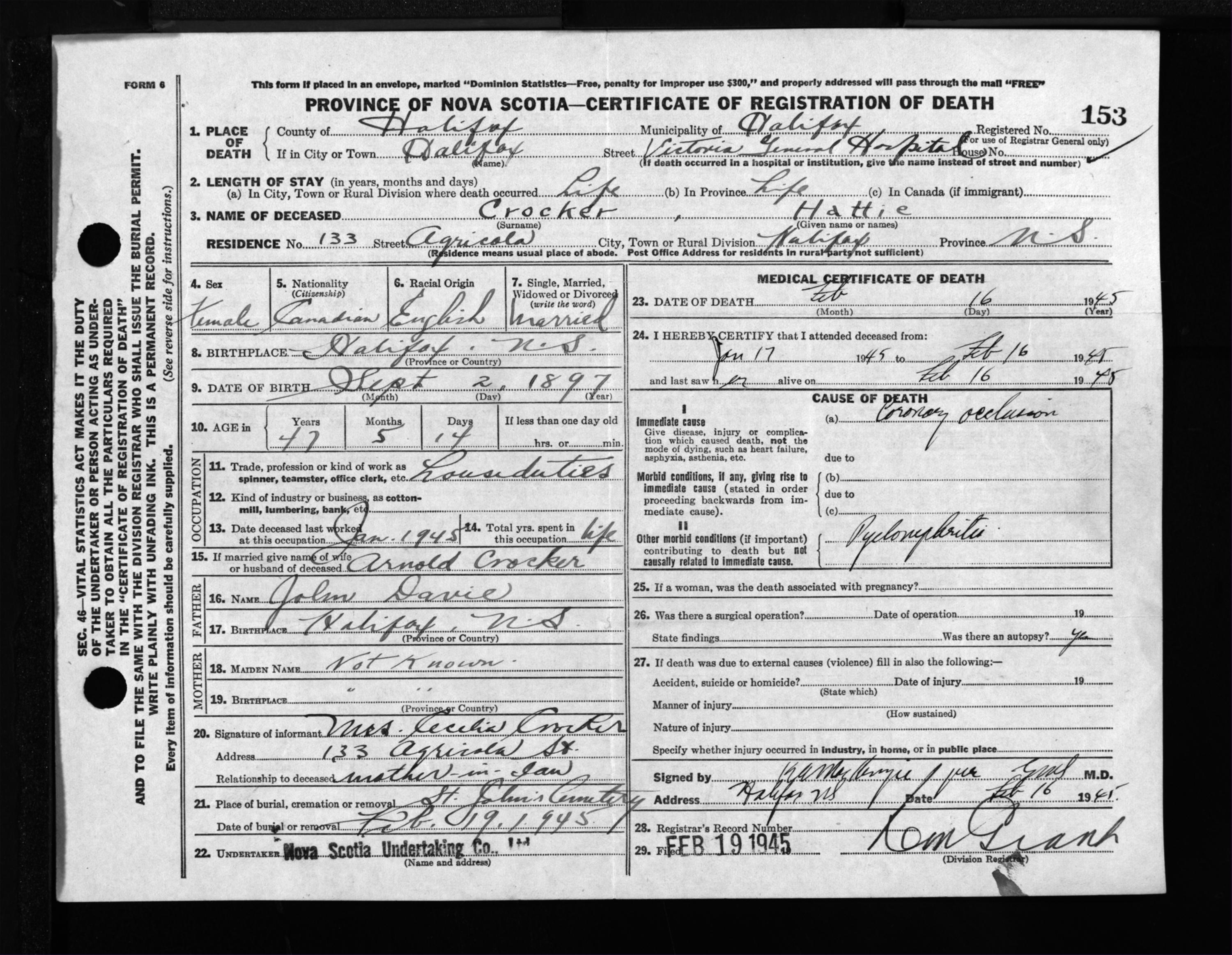 Female Death Registration: Year: 1945 file: 220 number: 153