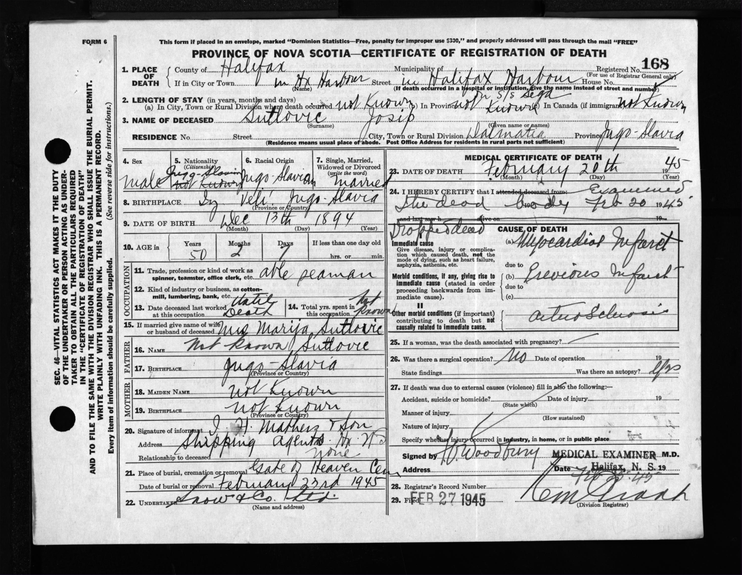 Male Death Registration: Year: 1945 file: 220 number: 168