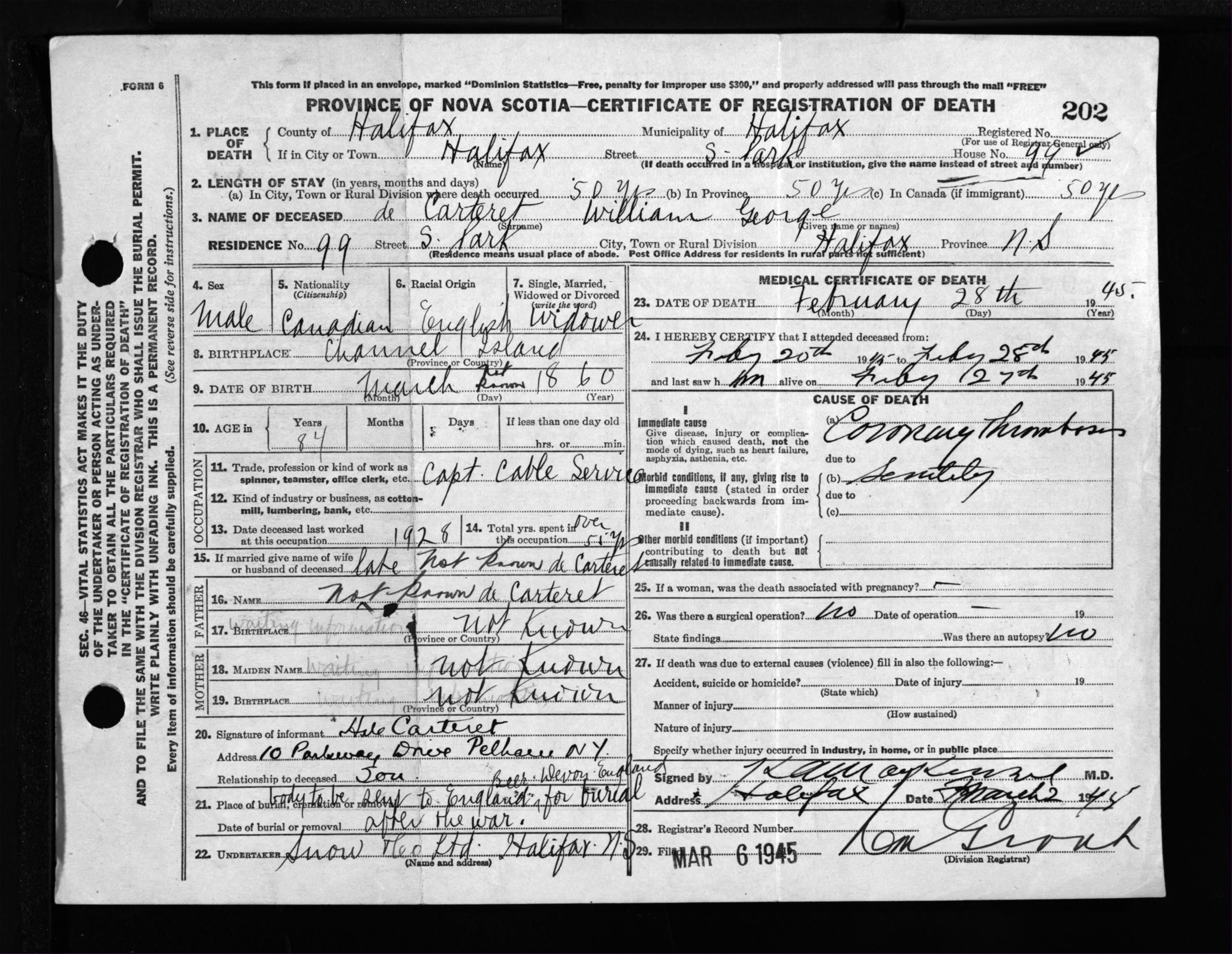 Male Death Registration: Year: 1945 file: 220 number: 202