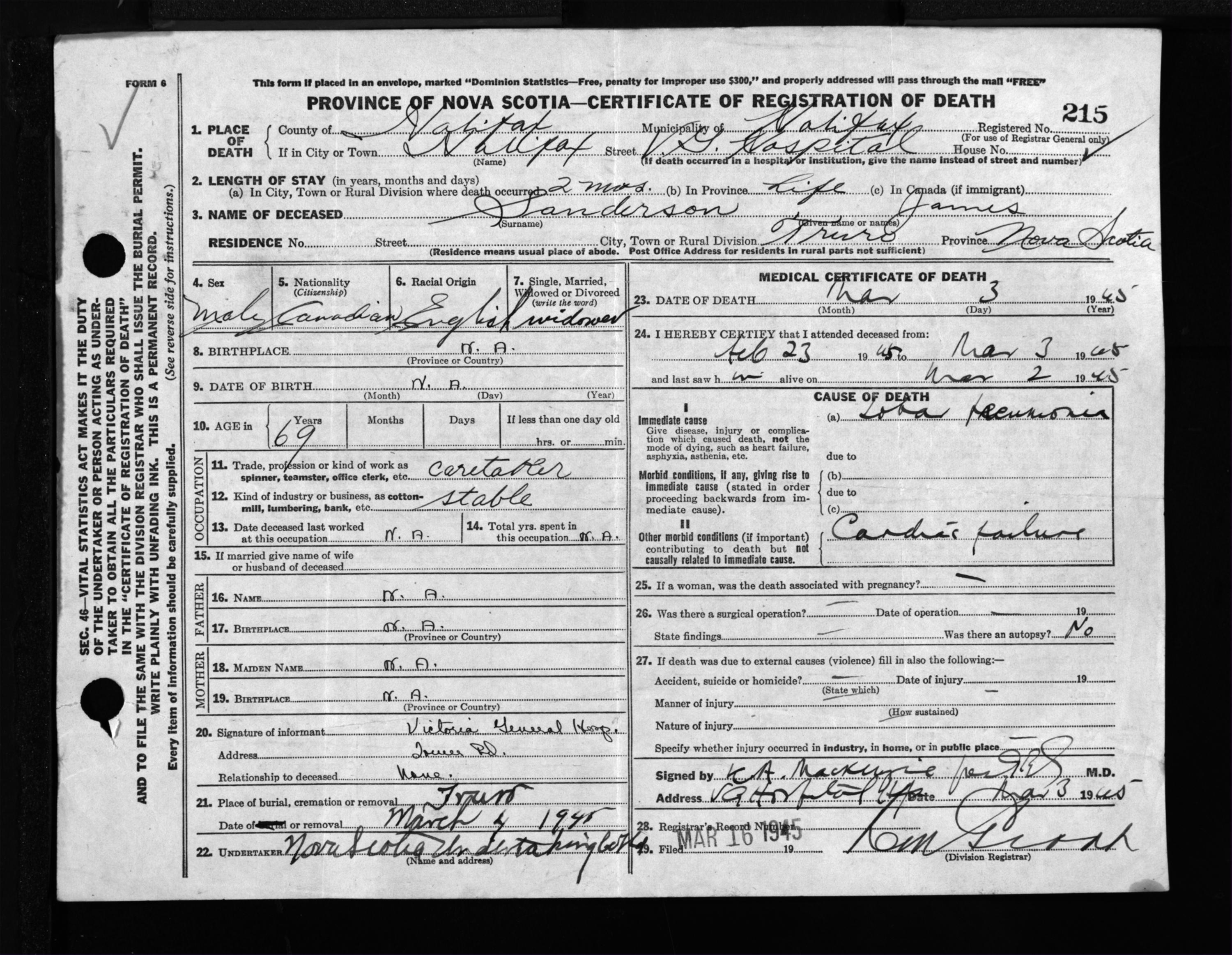 Male Death Registration: Year: 1945 file: 220 number: 215