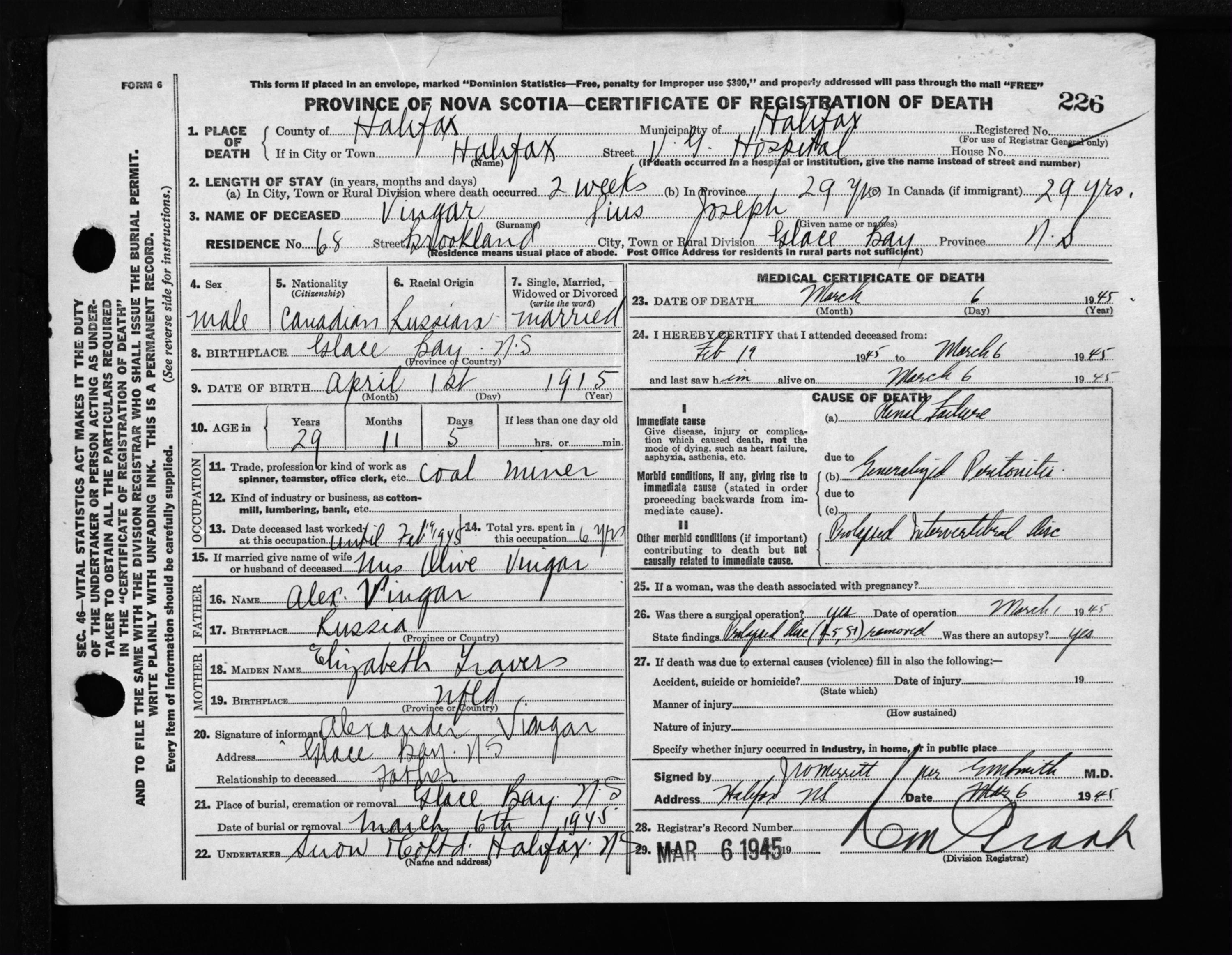 Male Death Registration: Year: 1945 file: 220 number: 226