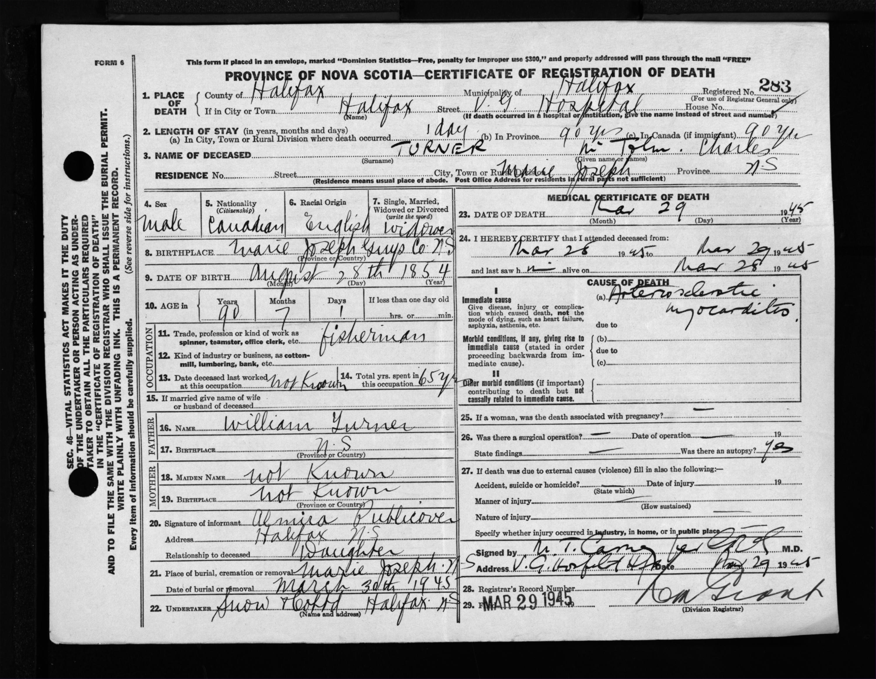 Male Death Registration: Year: 1945 file: 220 number: 283