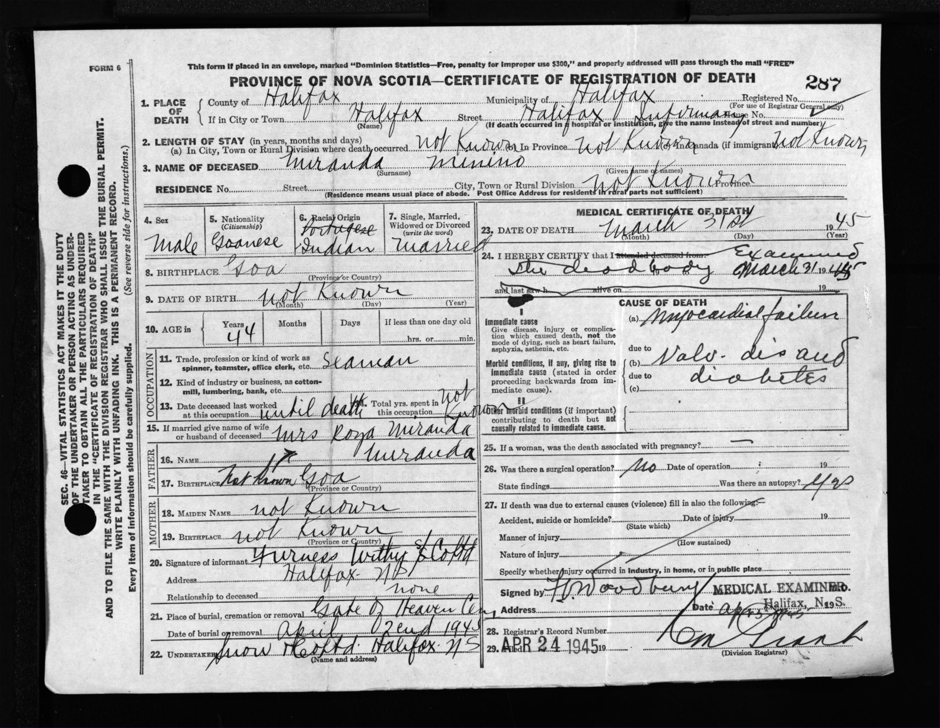 Male Death Registration: Year: 1945 file: 220 number: 287