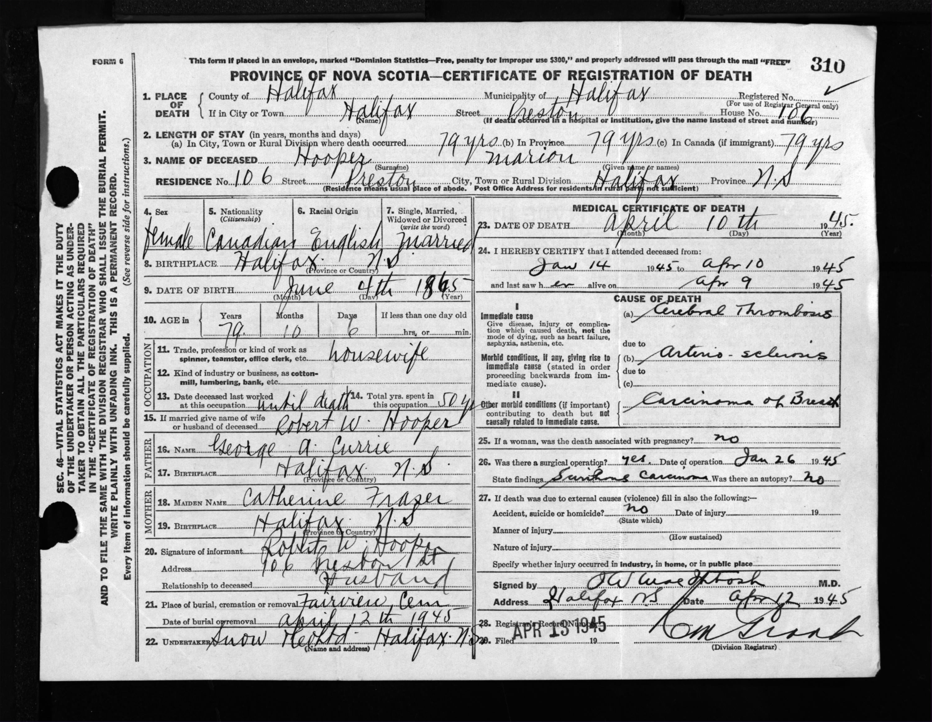 Female Death Registration: Year: 1945 file: 220 number: 310
