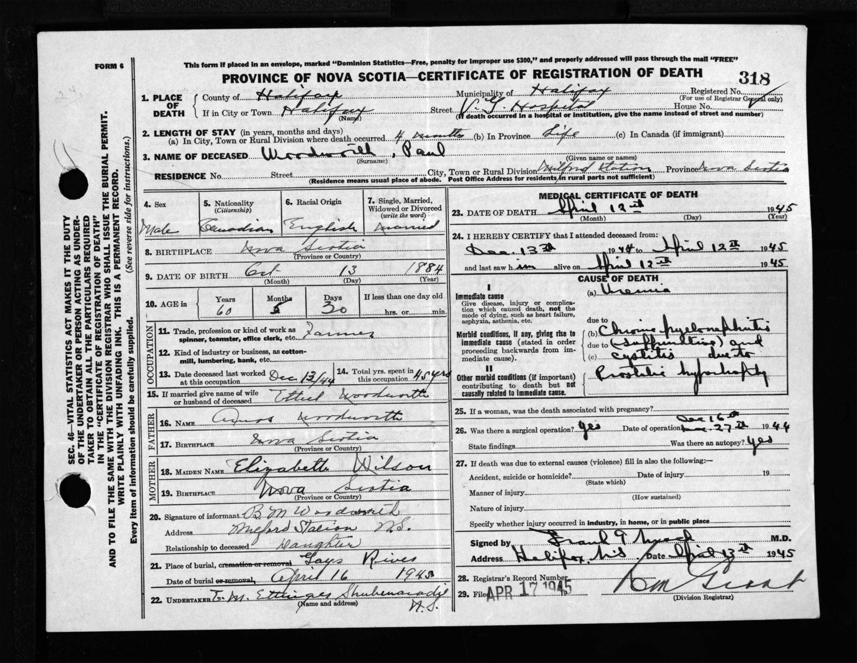 Male Death Registration: Year: 1945 file: 220 number: 318
