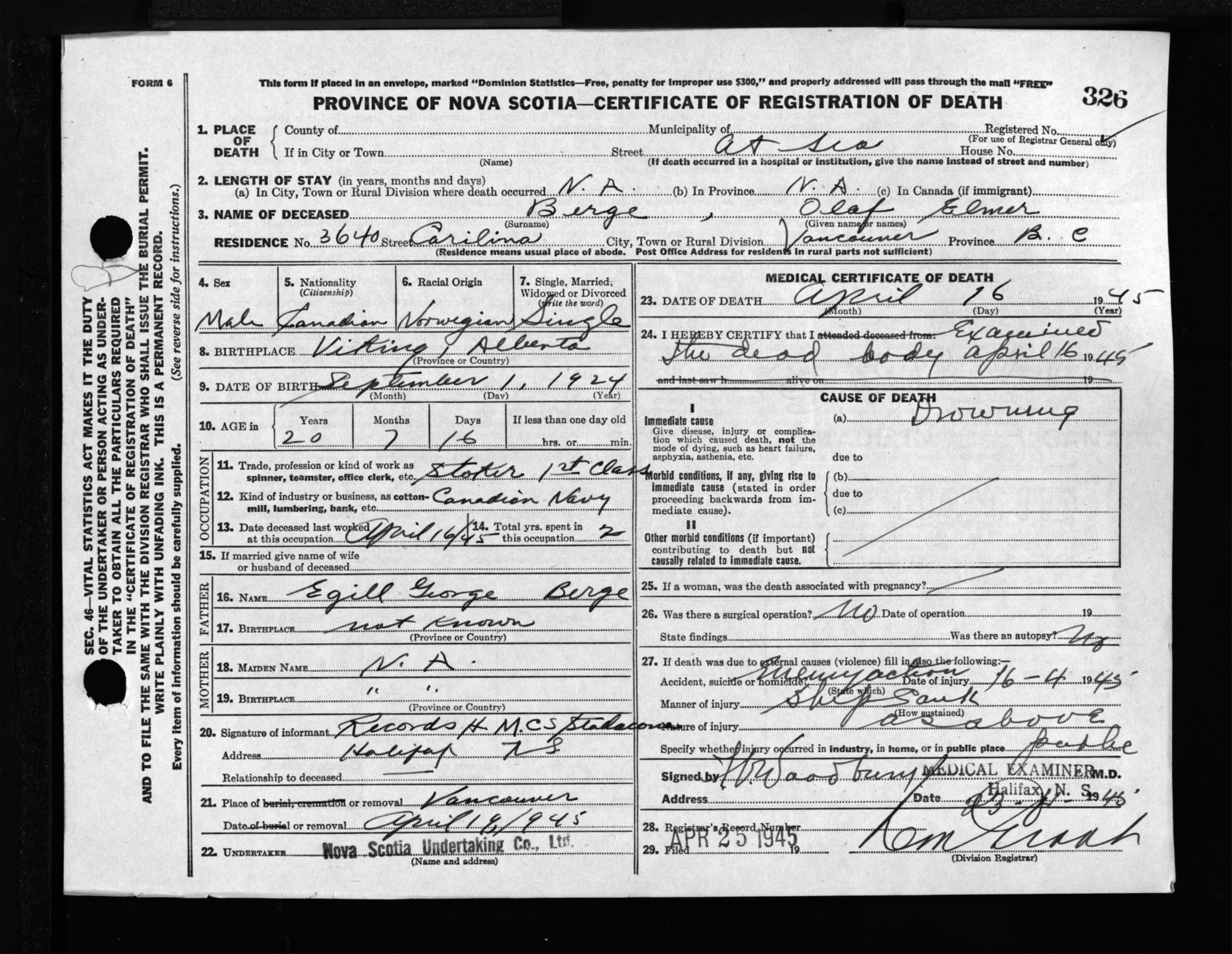 Male Death Registration: Year: 1945 file: 220 number: 326