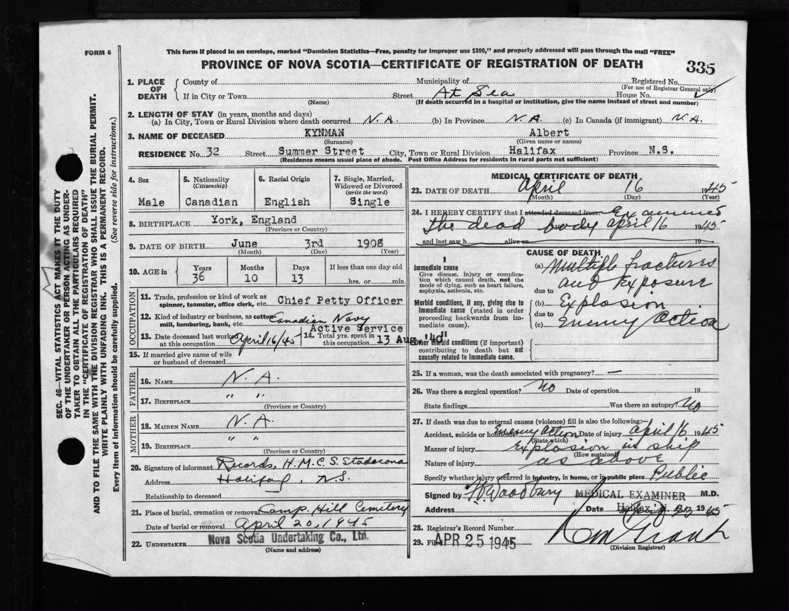 Male Death Registration: Year: 1945 file: 220 number: 335