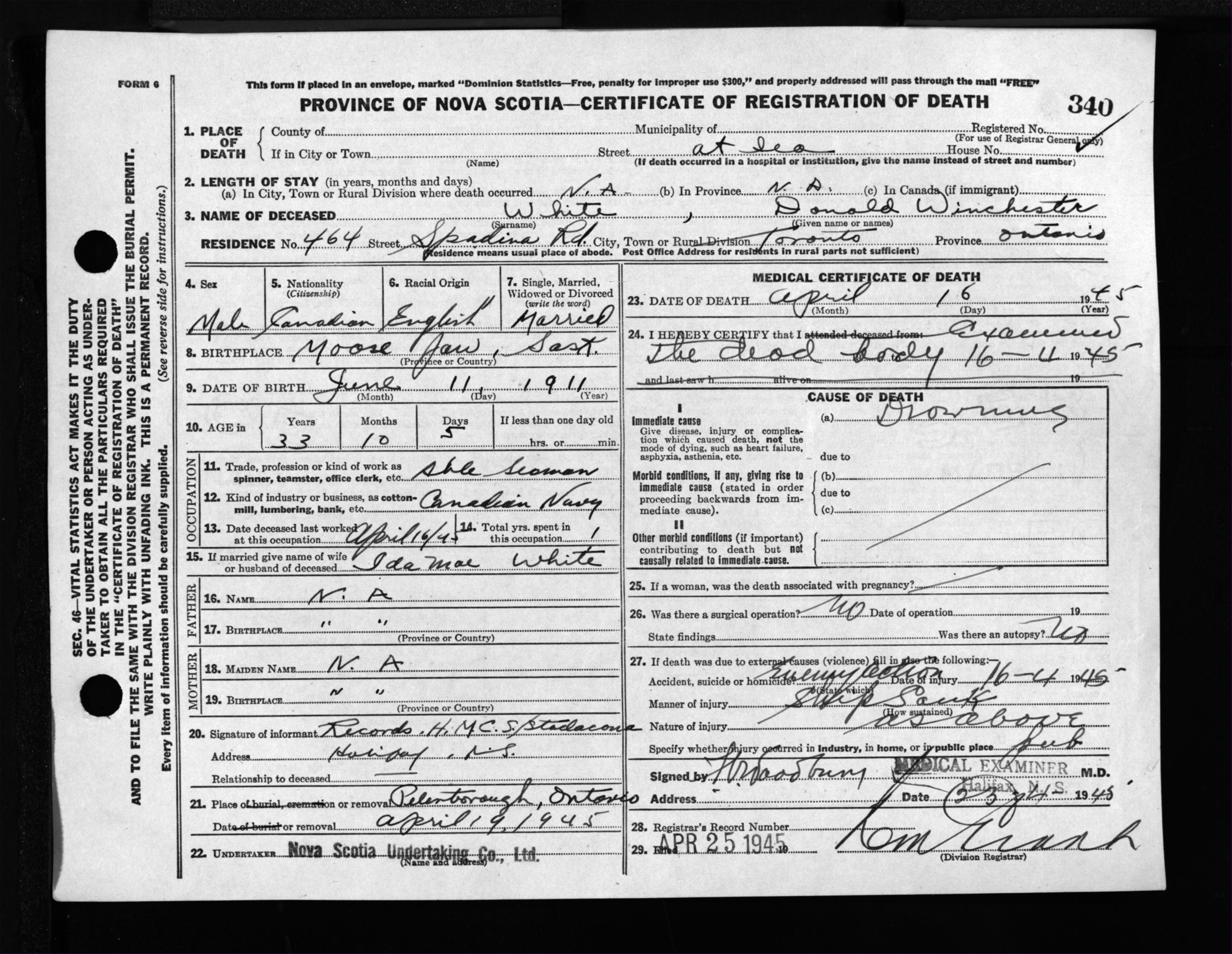Male Death Registration: Year: 1945 file: 220 number: 340