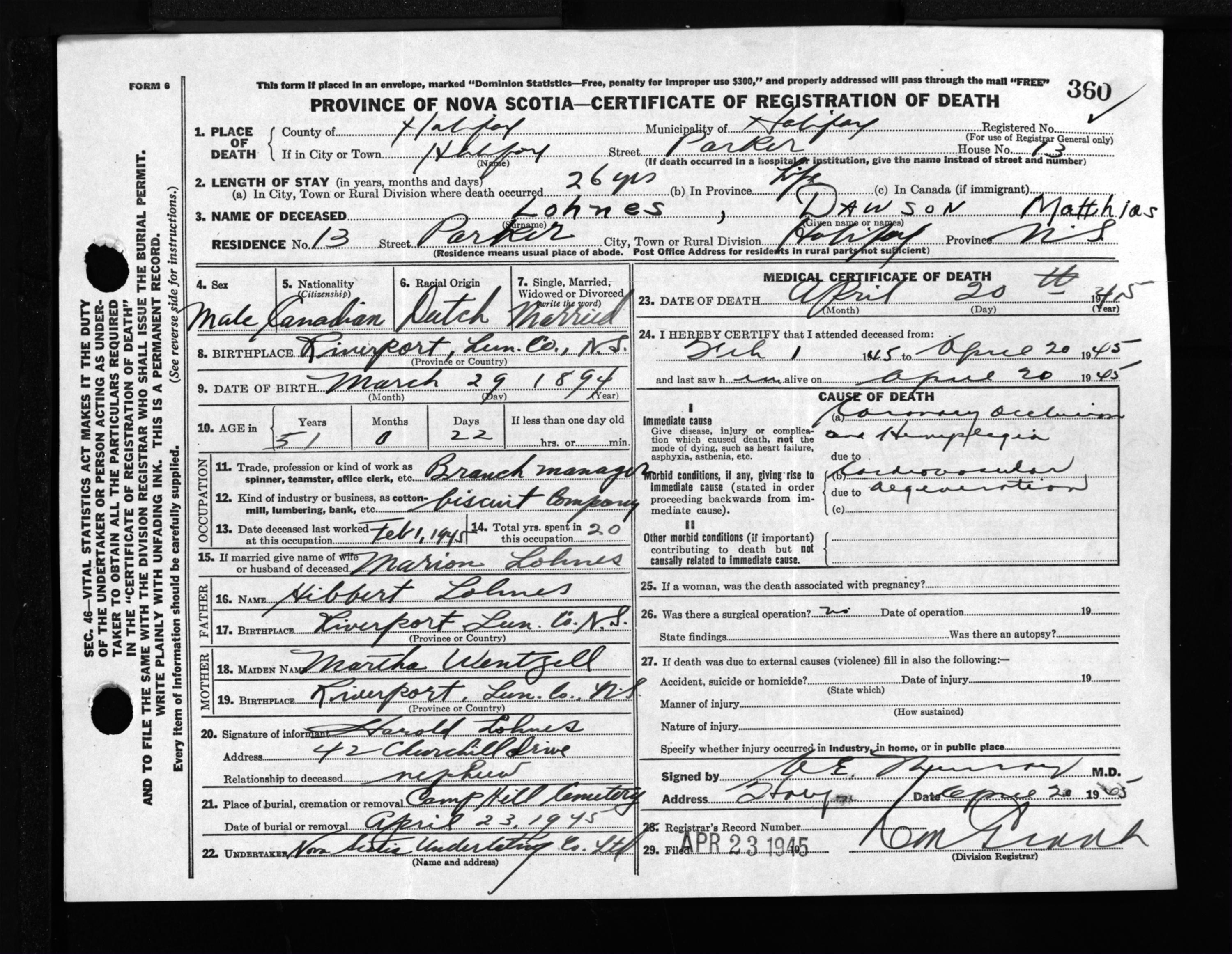 Male Death Registration: Year: 1945 file: 220 number: 360