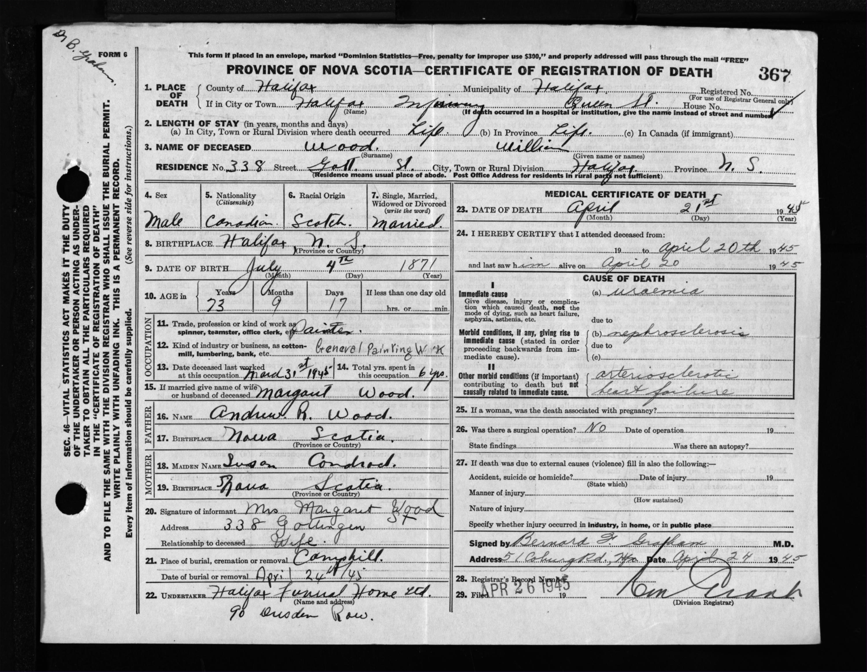 Male Death Registration: Year: 1945 file: 220 number: 367