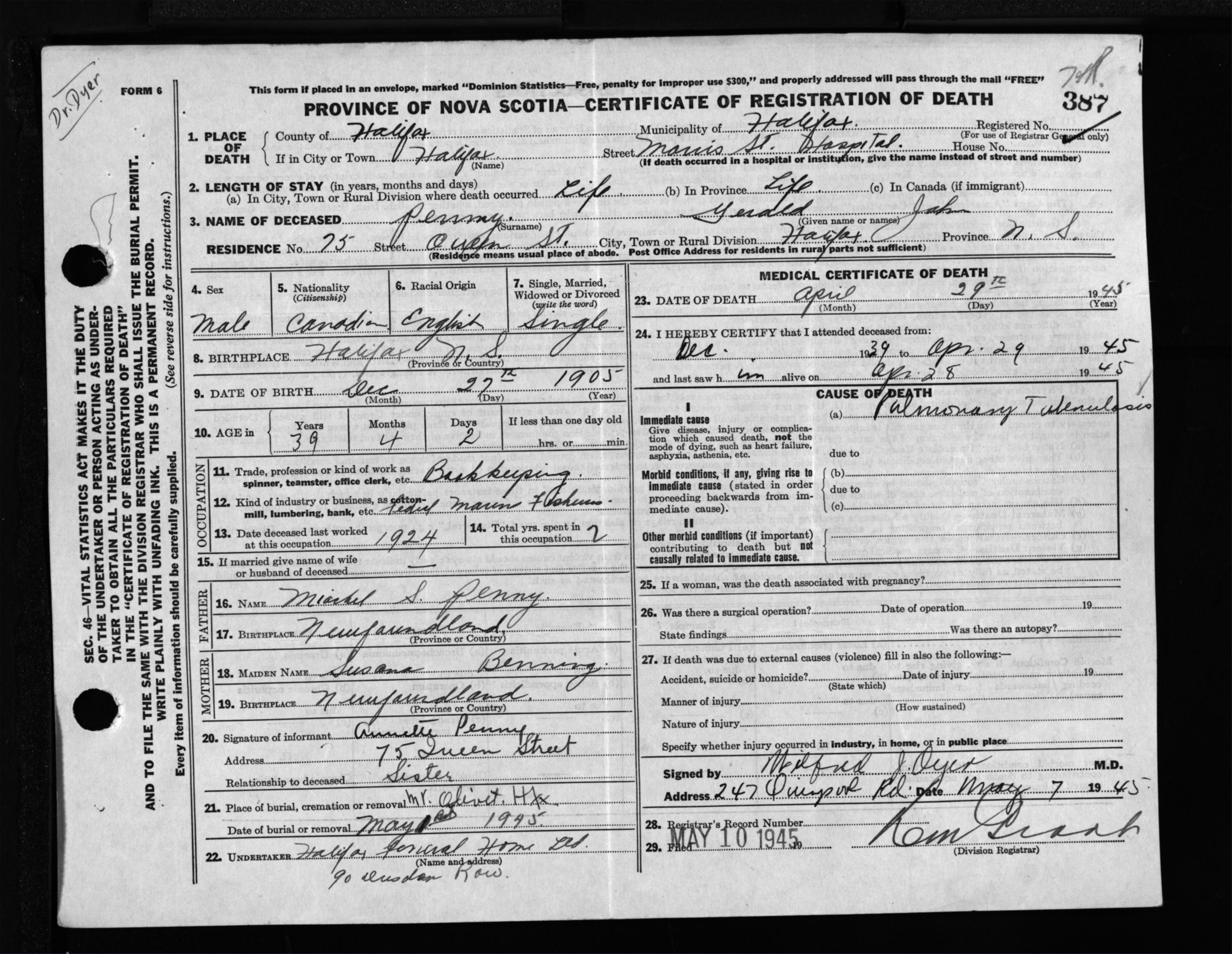 Male Death Registration: Year: 1945 file: 220 number: 387
