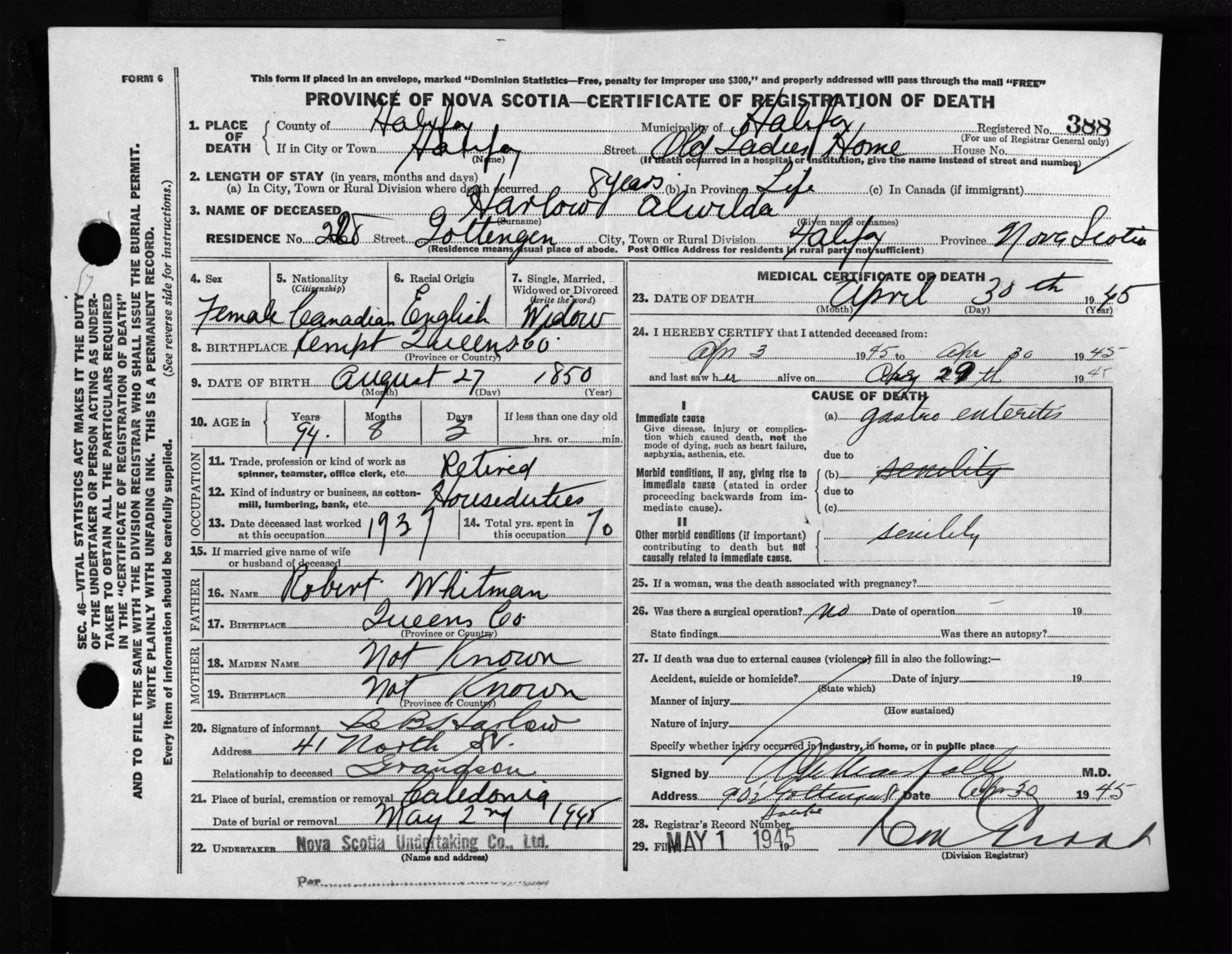 Female Death Registration: Year: 1945 file: 220 number: 388