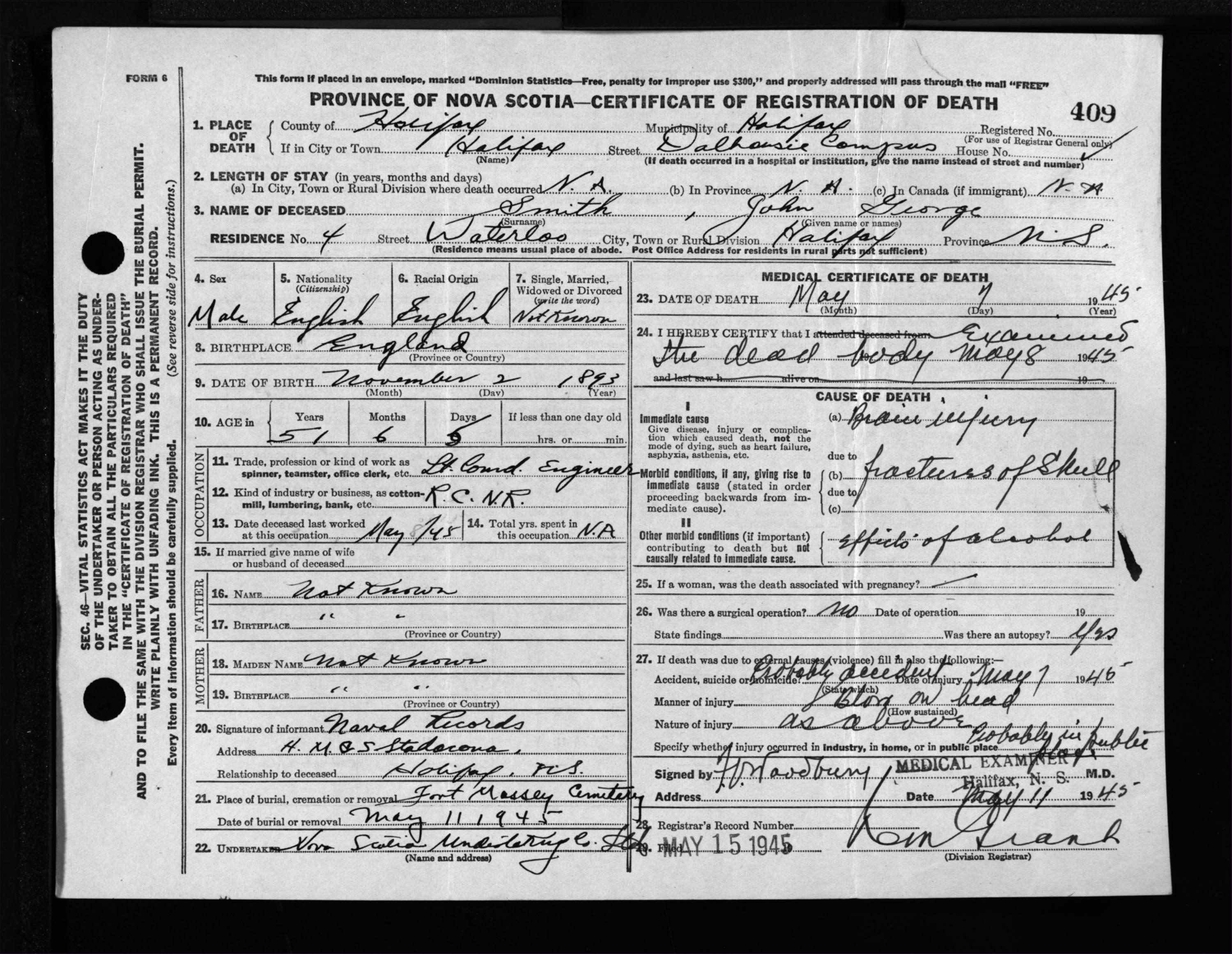 Male Death Registration: Year: 1945 file: 220 number: 409