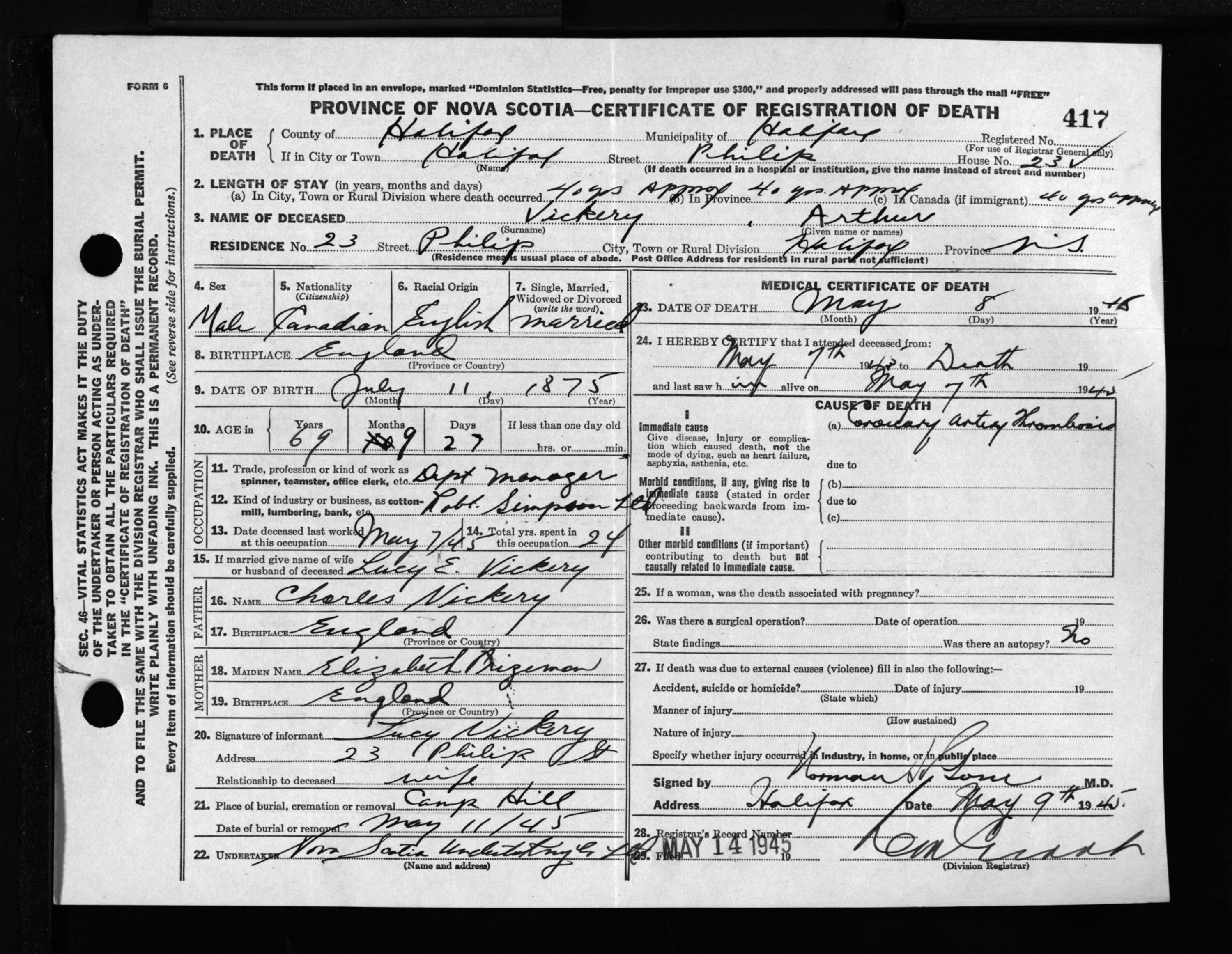 Male Death Registration: Year: 1945 file: 220 number: 417