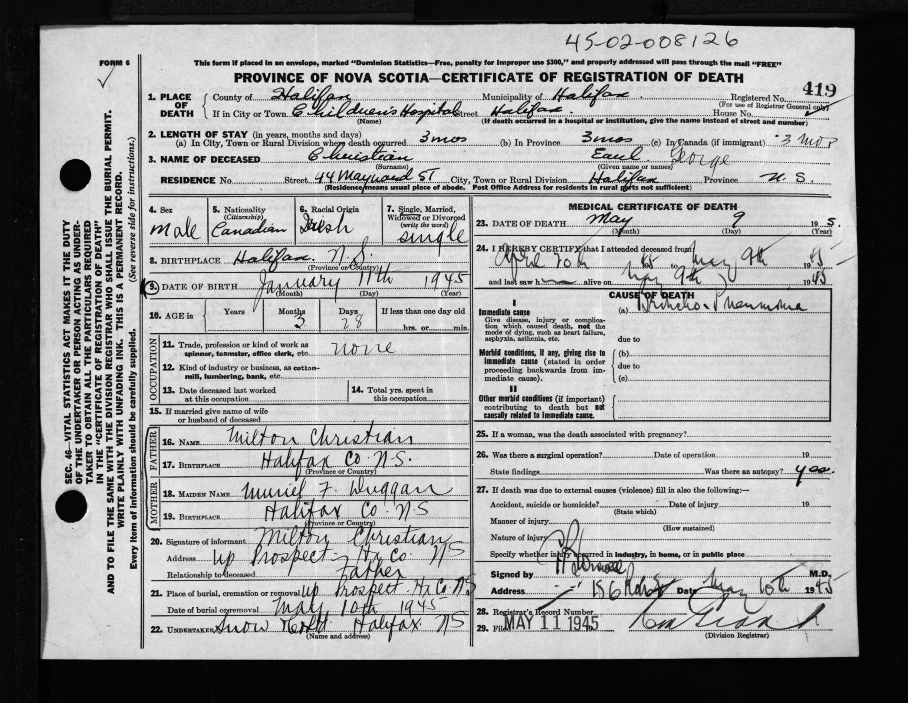 Male Death Registration: Year: 1945 file: 220 number: 419