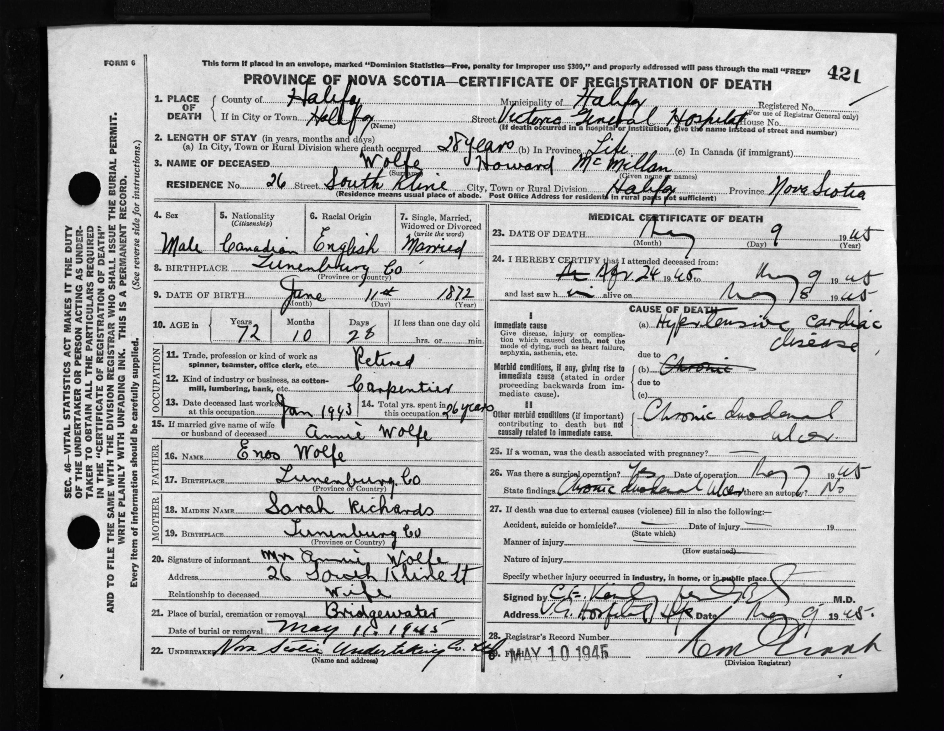 Male Death Registration: Year: 1945 file: 220 number: 421