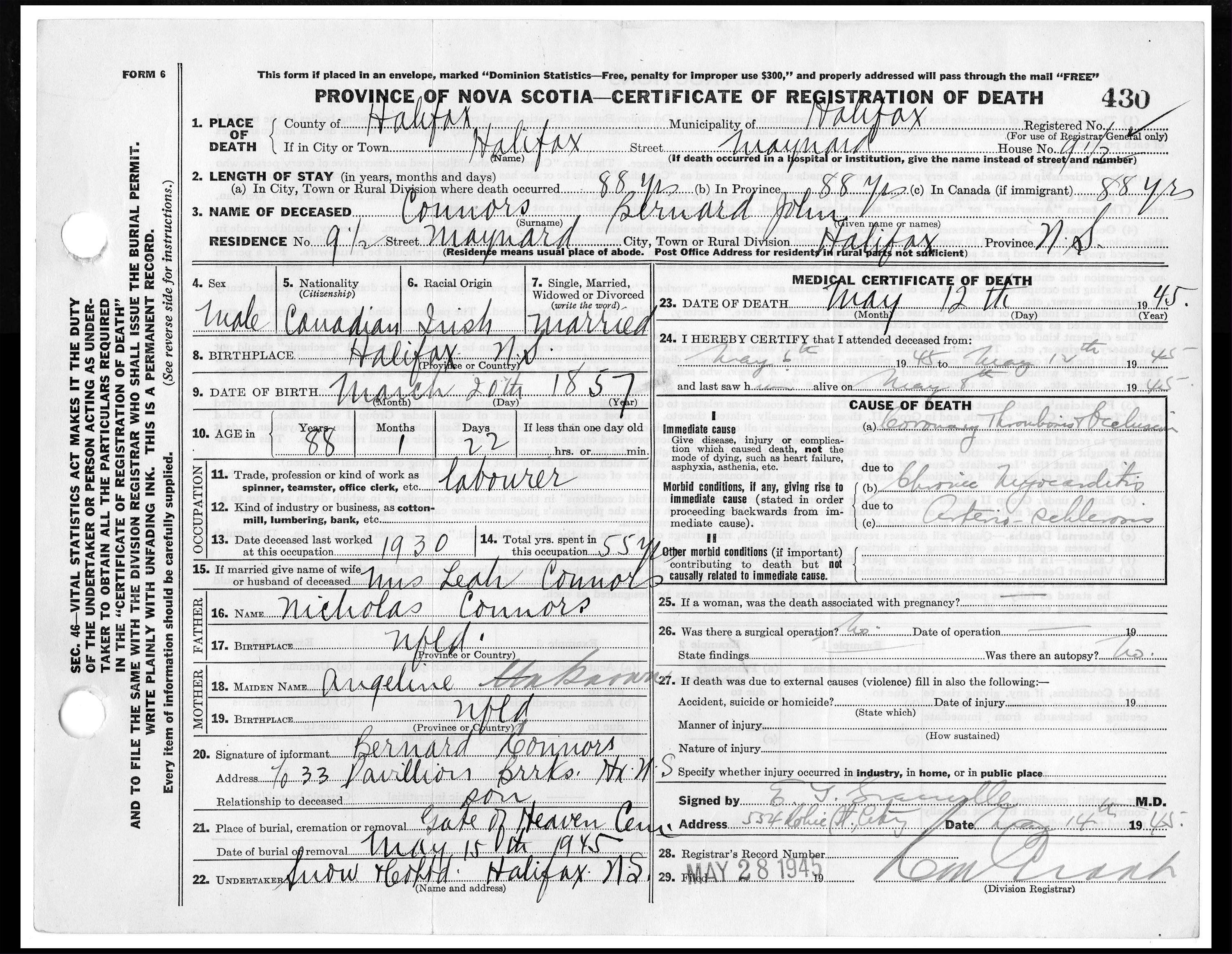 Male Death Registration: Year: 1945 file: 220 number: 430