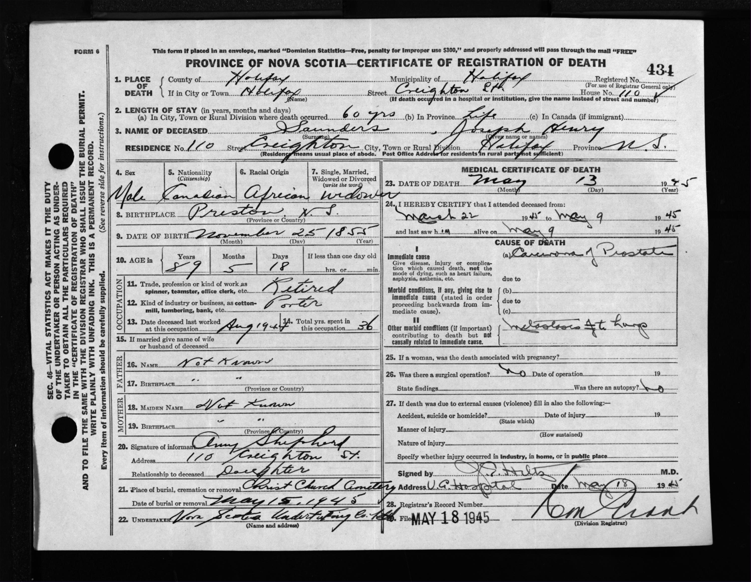 Male Death Registration: Year: 1945 file: 220 number: 434