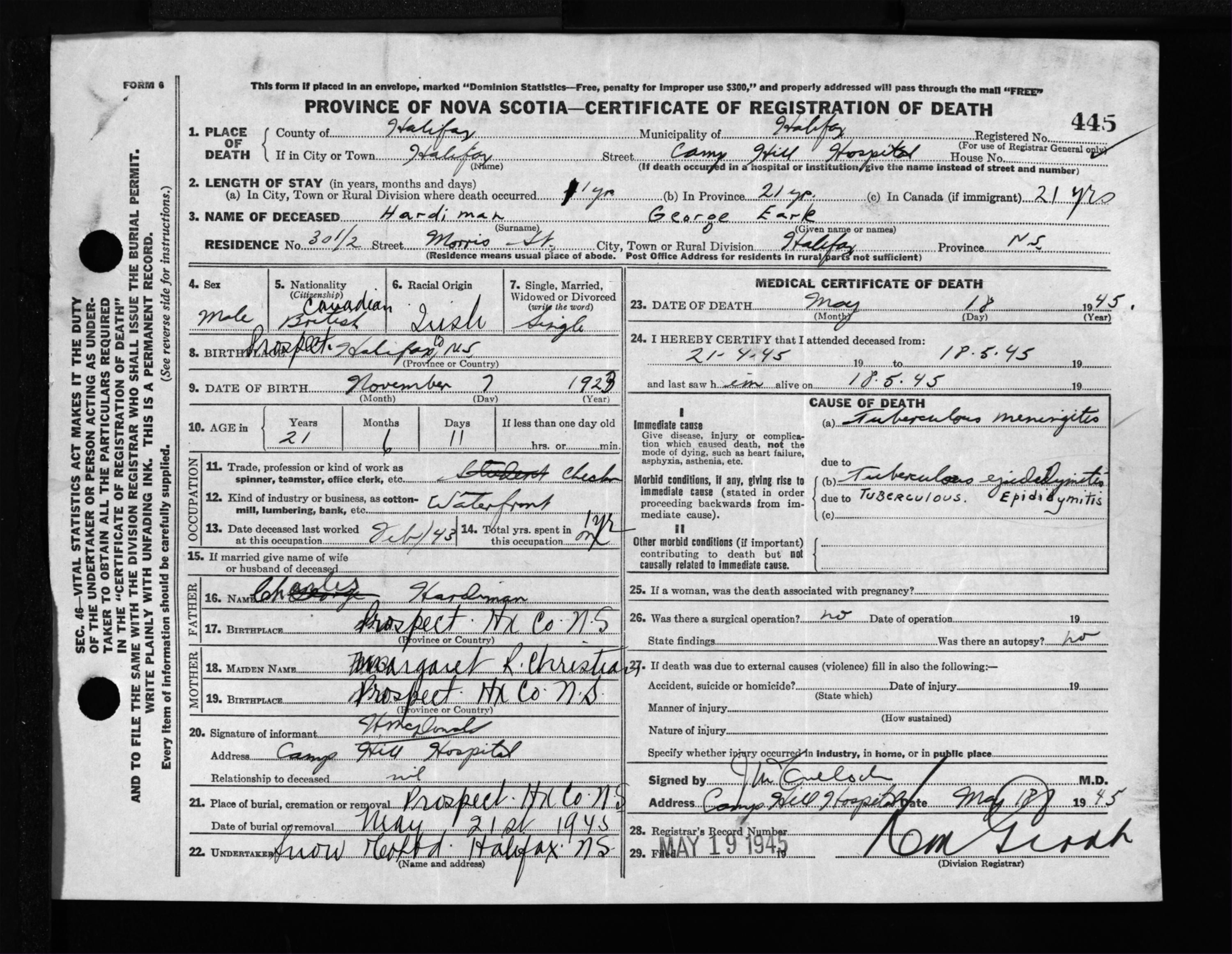 Male Death Registration: Year: 1945 file: 220 number: 445
