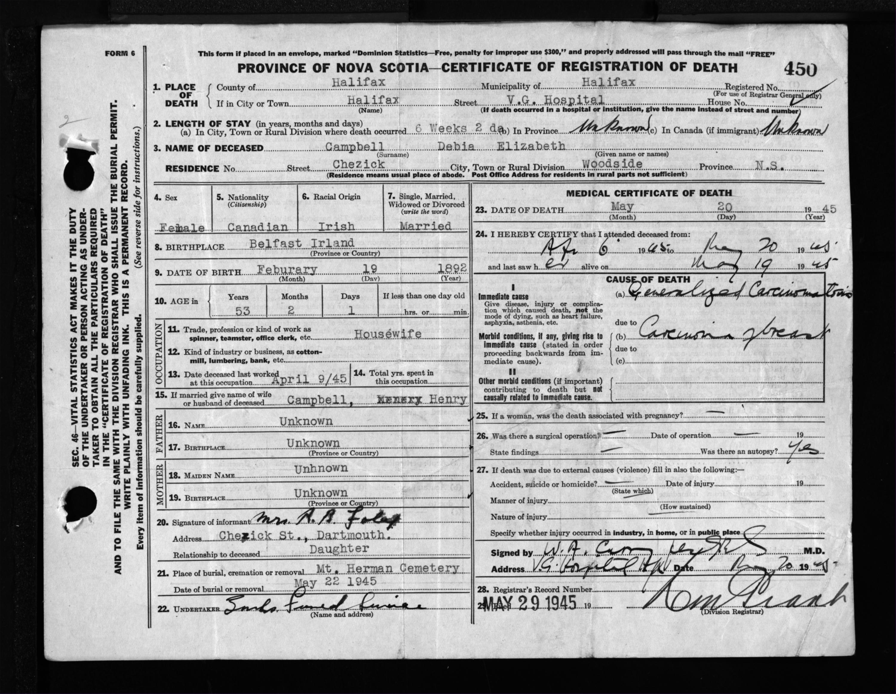 Female Death Registration: Year: 1945 file: 220 number: 450