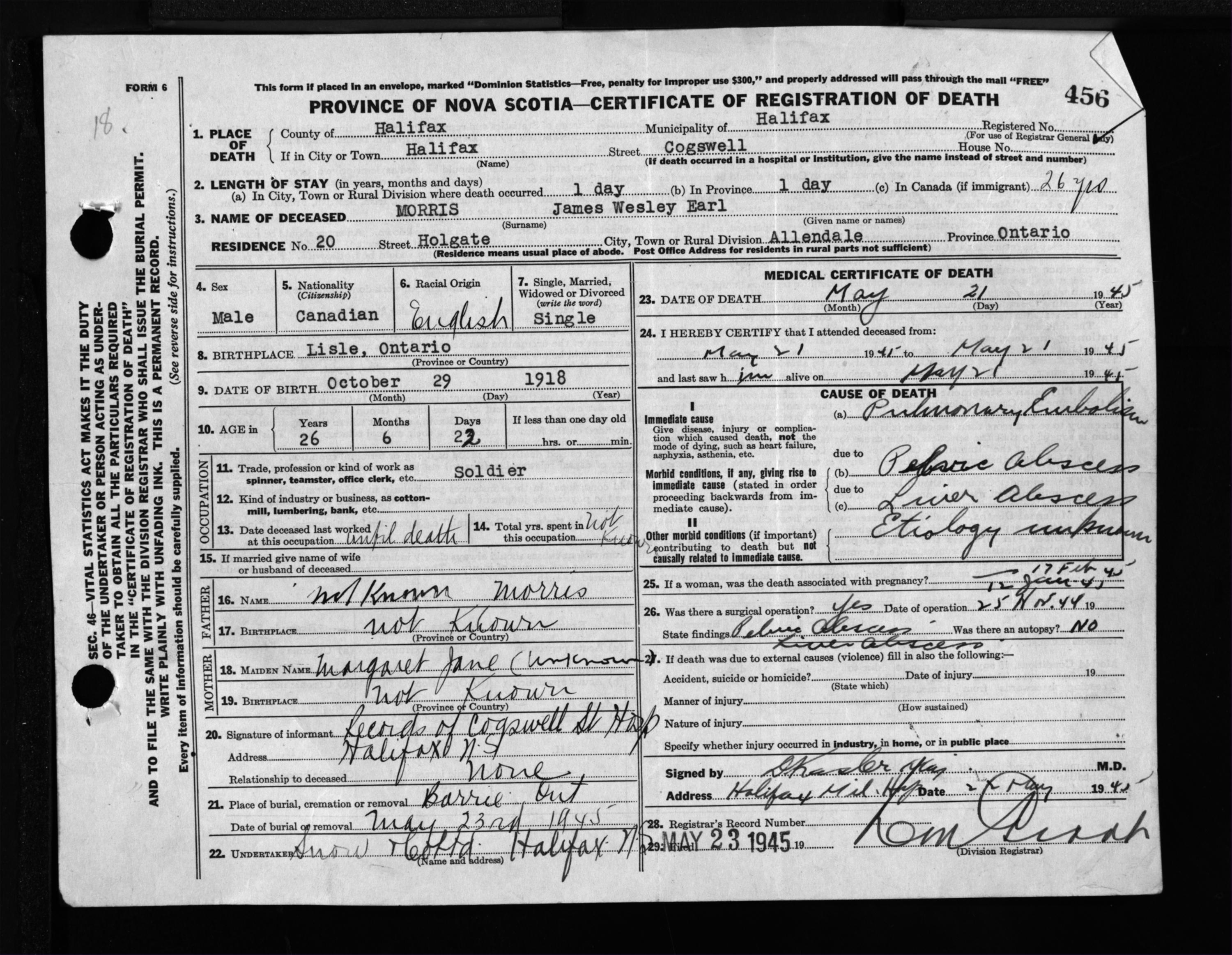 Male Death Registration: Year: 1945 file: 220 number: 456