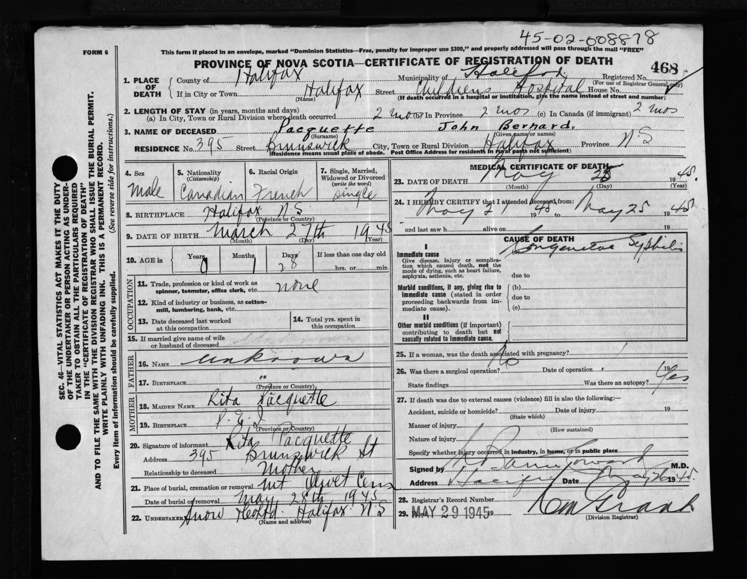 Male Death Registration: Year: 1945 file: 220 number: 468