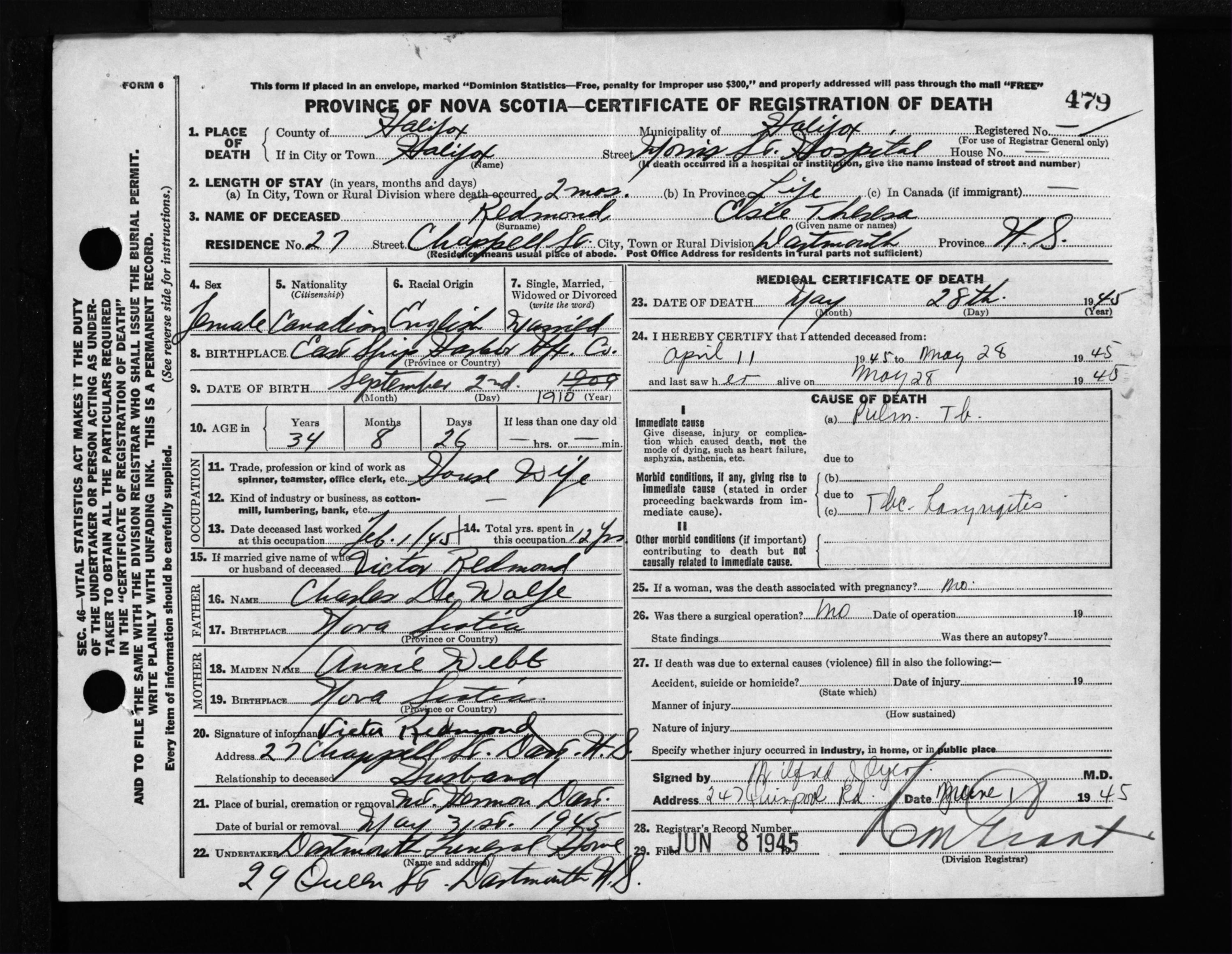 Female Death Registration: Year: 1945 file: 220 number: 479