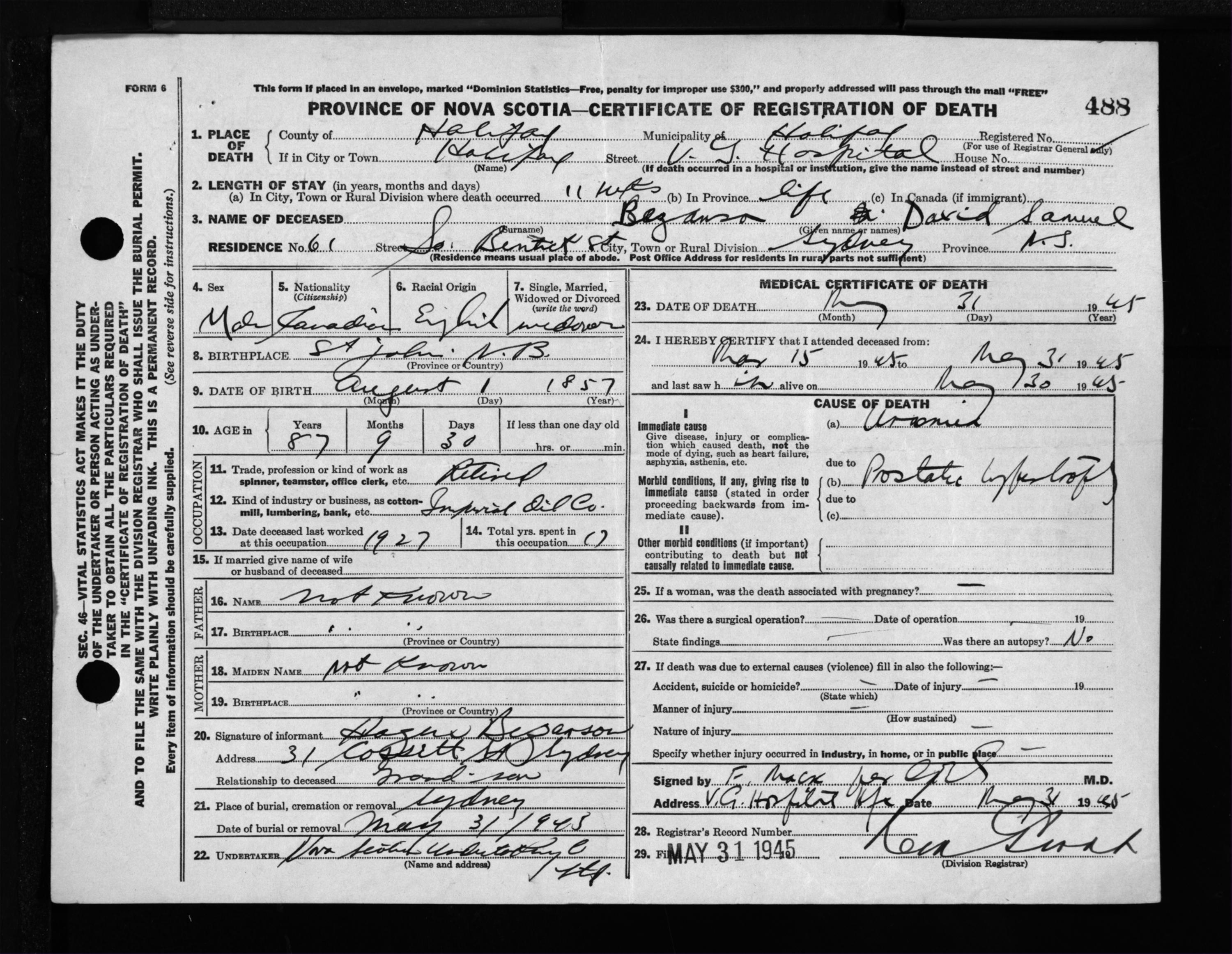 Male Death Registration: Year: 1945 file: 220 number: 488