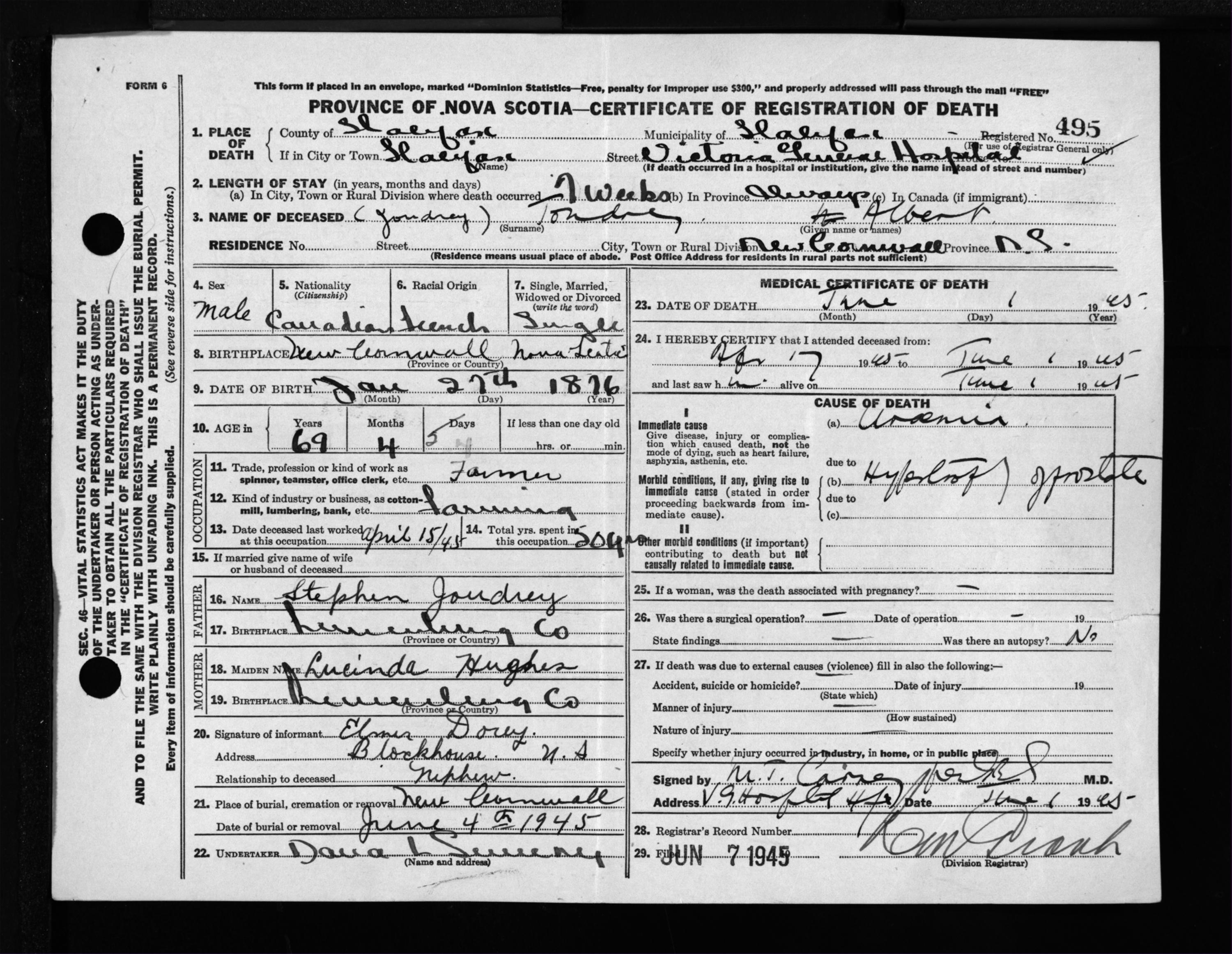 Male Death Registration: Year: 1945 file: 220 number: 495