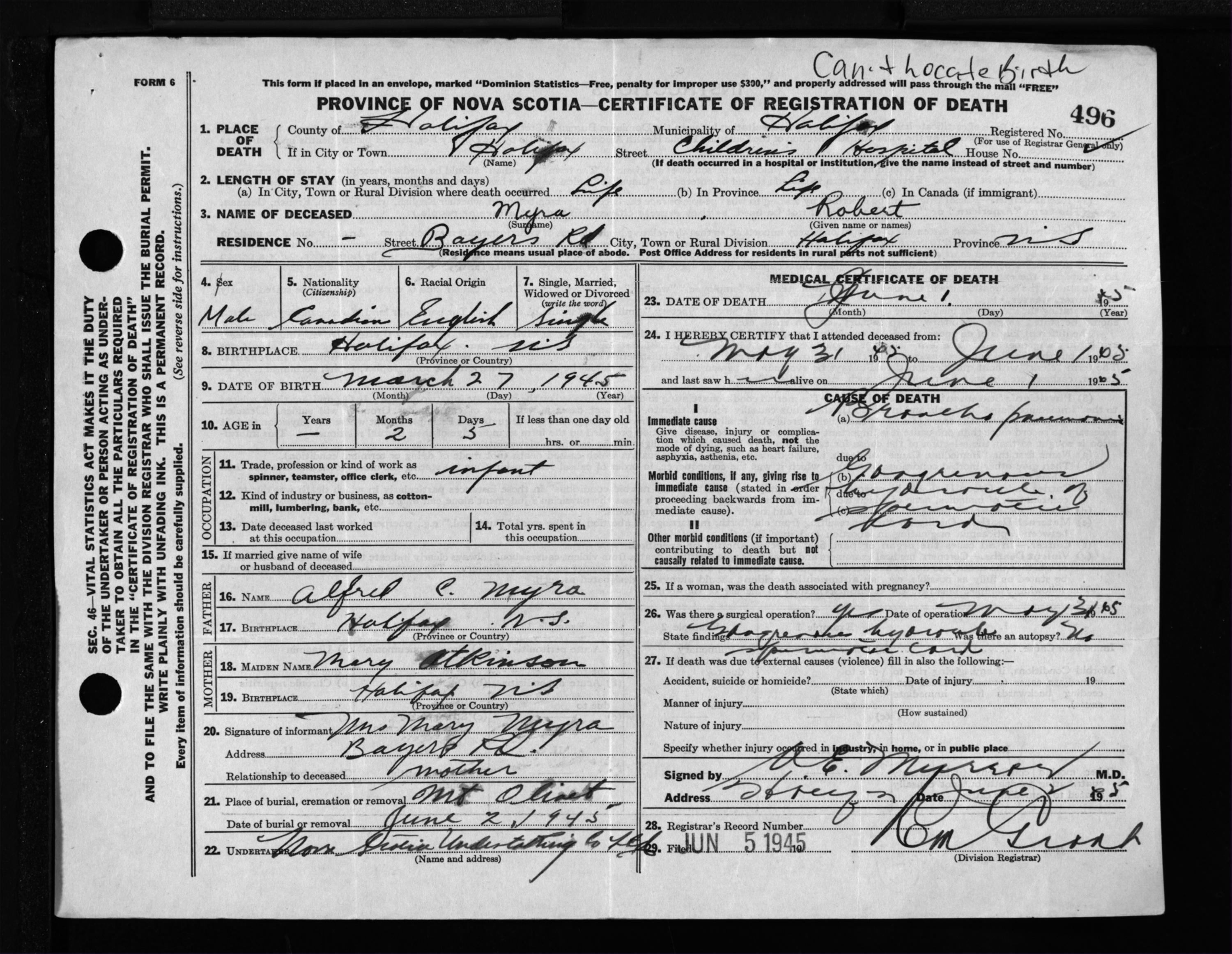 Male Death Registration: Year: 1945 file: 220 number: 496