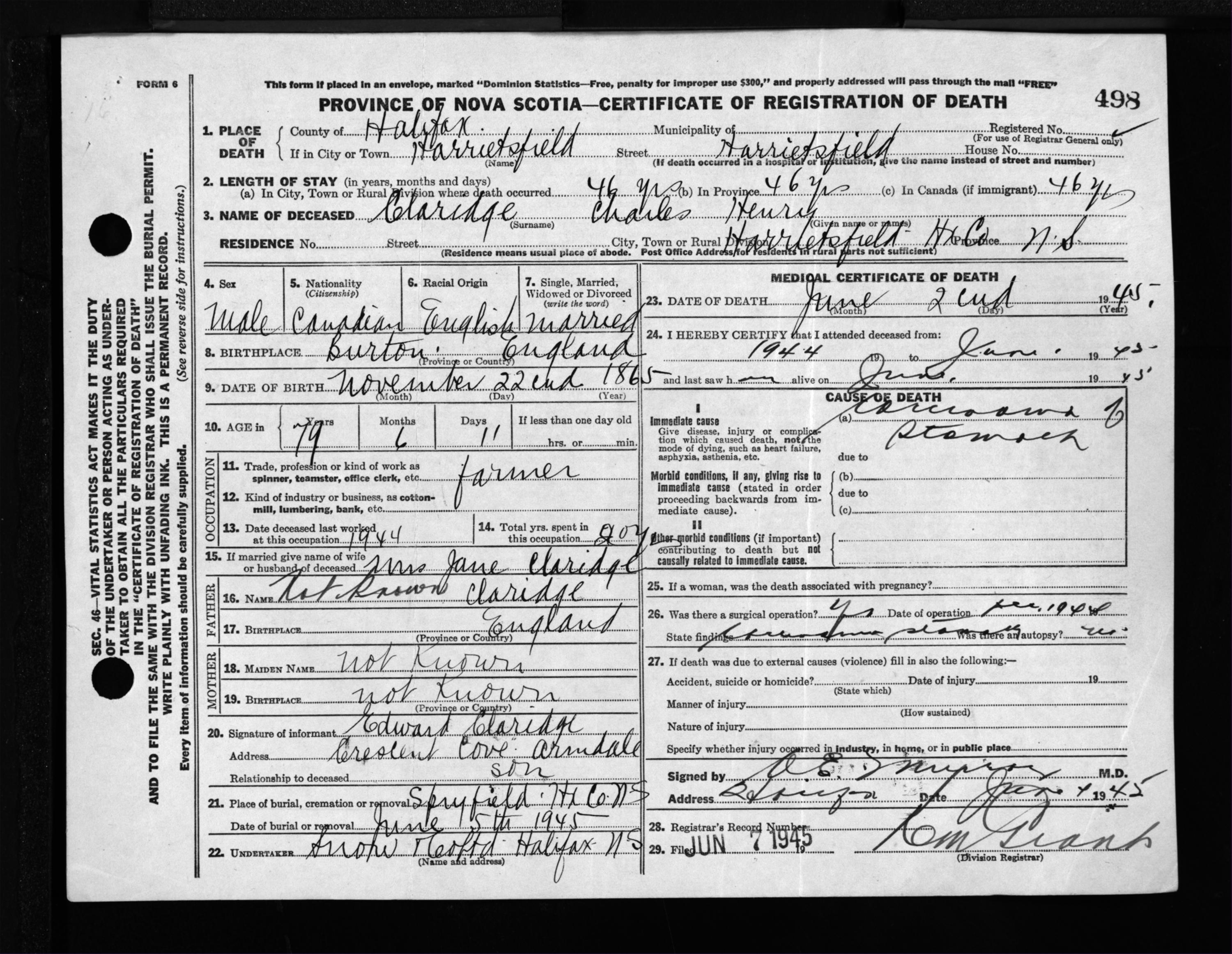 Male Death Registration: Year: 1945 file: 220 number: 498