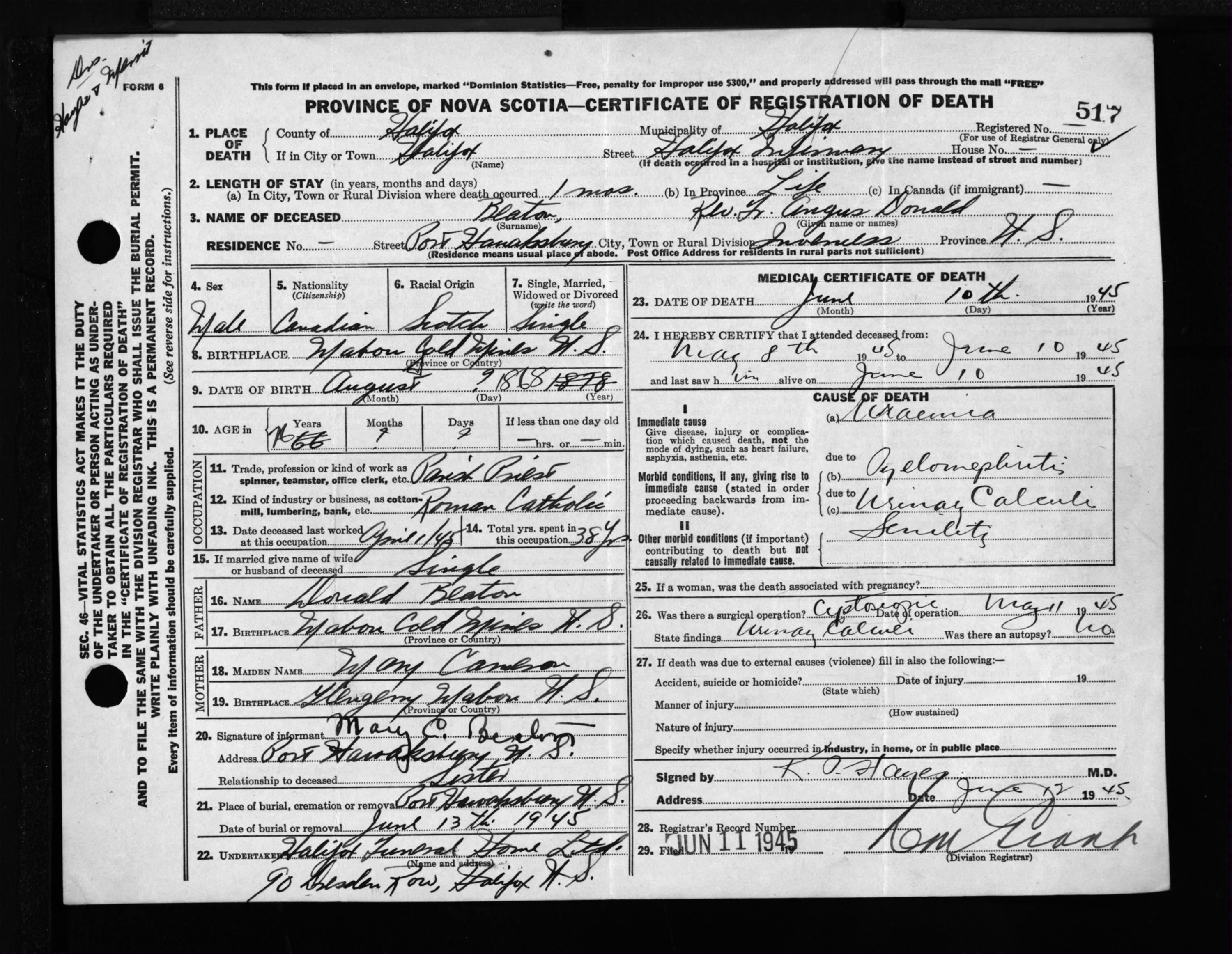 Male Death Registration: Year: 1945 file: 220 number: 517