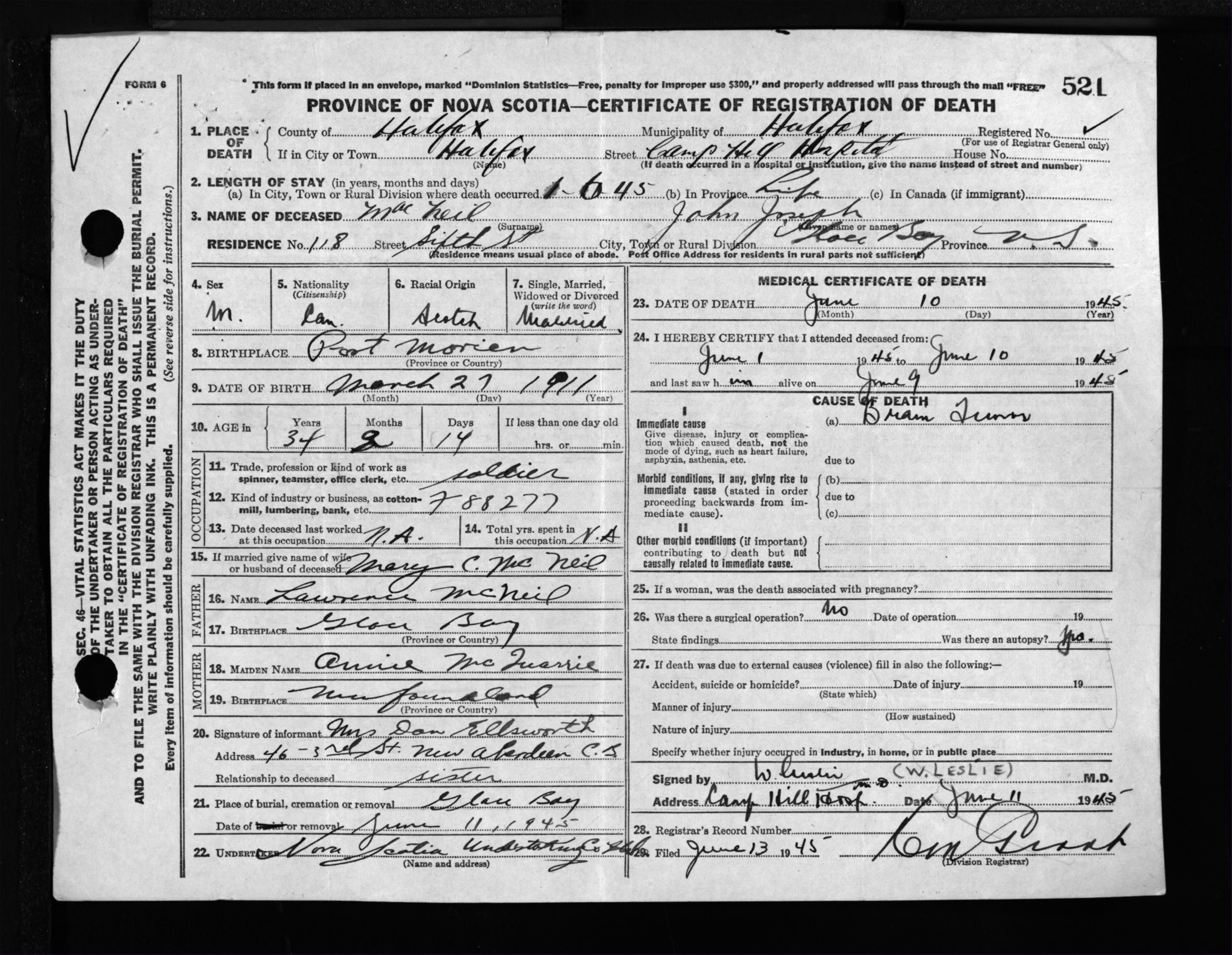 Male Death Registration: Year: 1945 file: 220 number: 521