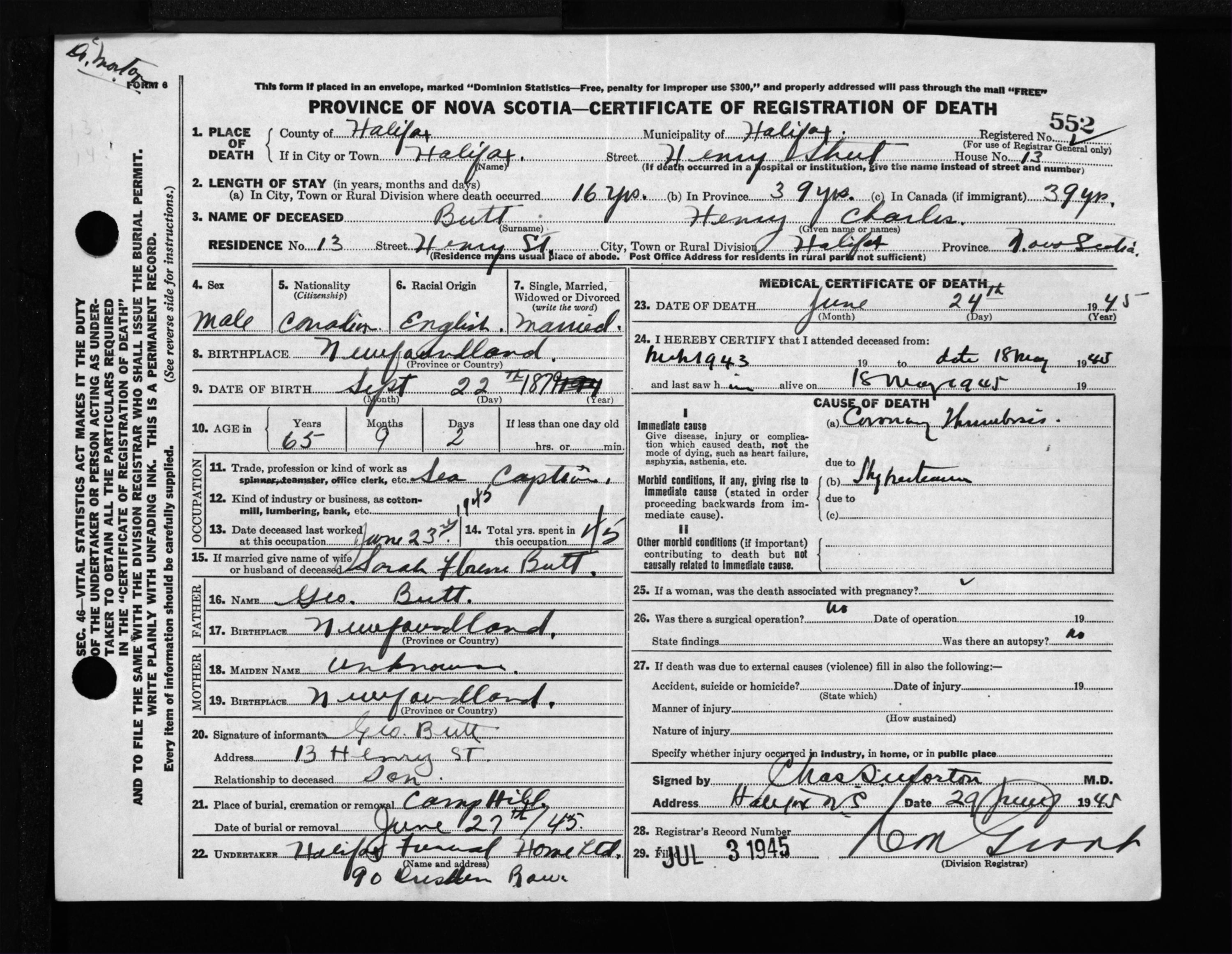 Male Death Registration: Year: 1945 file: 220 number: 552