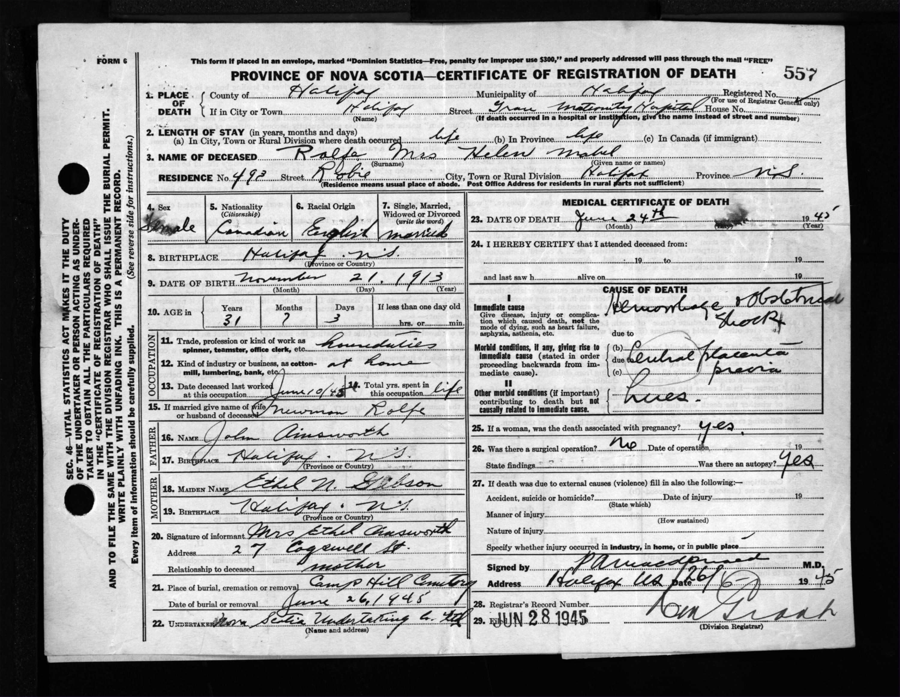 Death Registration: Year: 1945 file: 220 number: 557