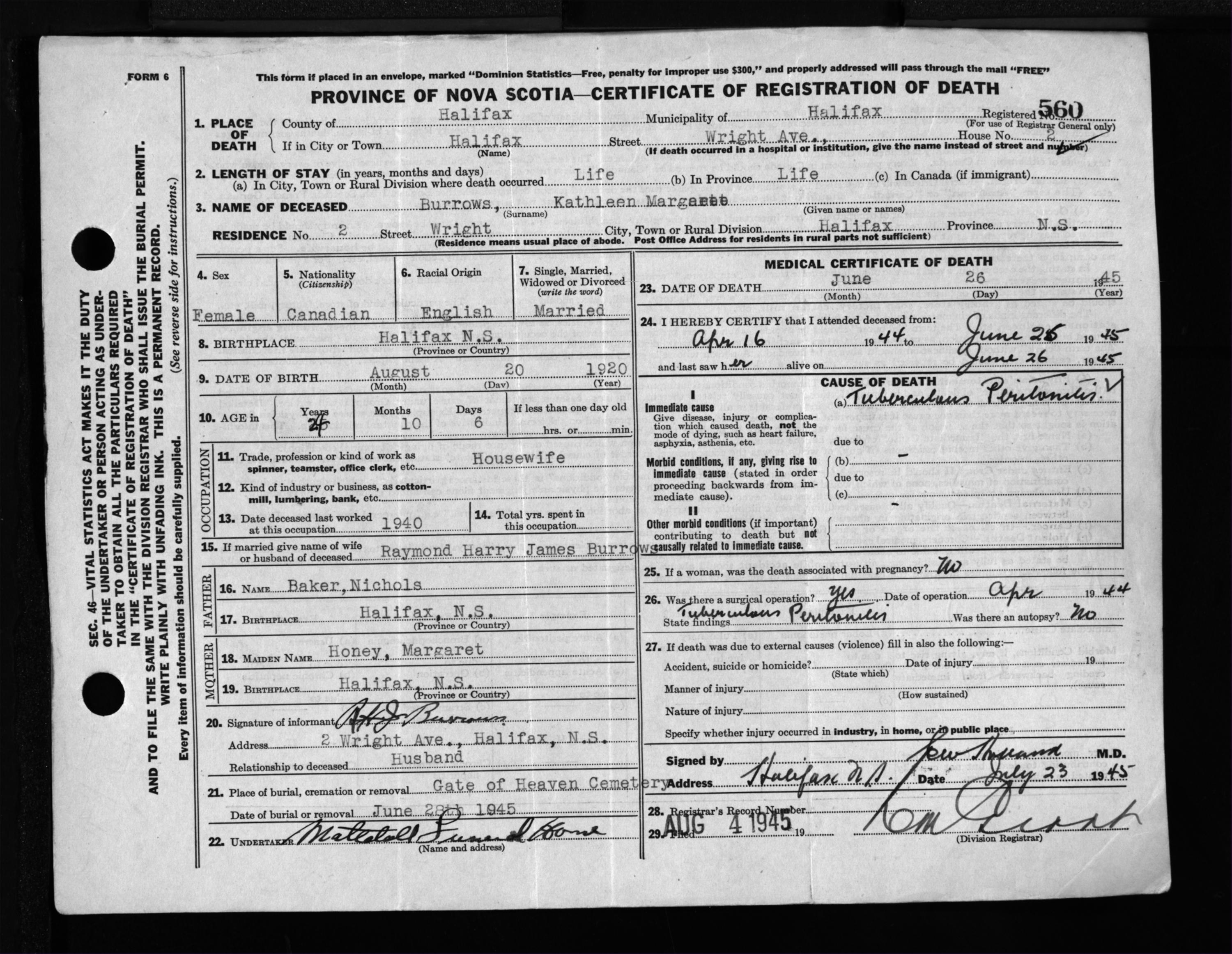 Female Death Registration: Year: 1945 file: 220 number: 560