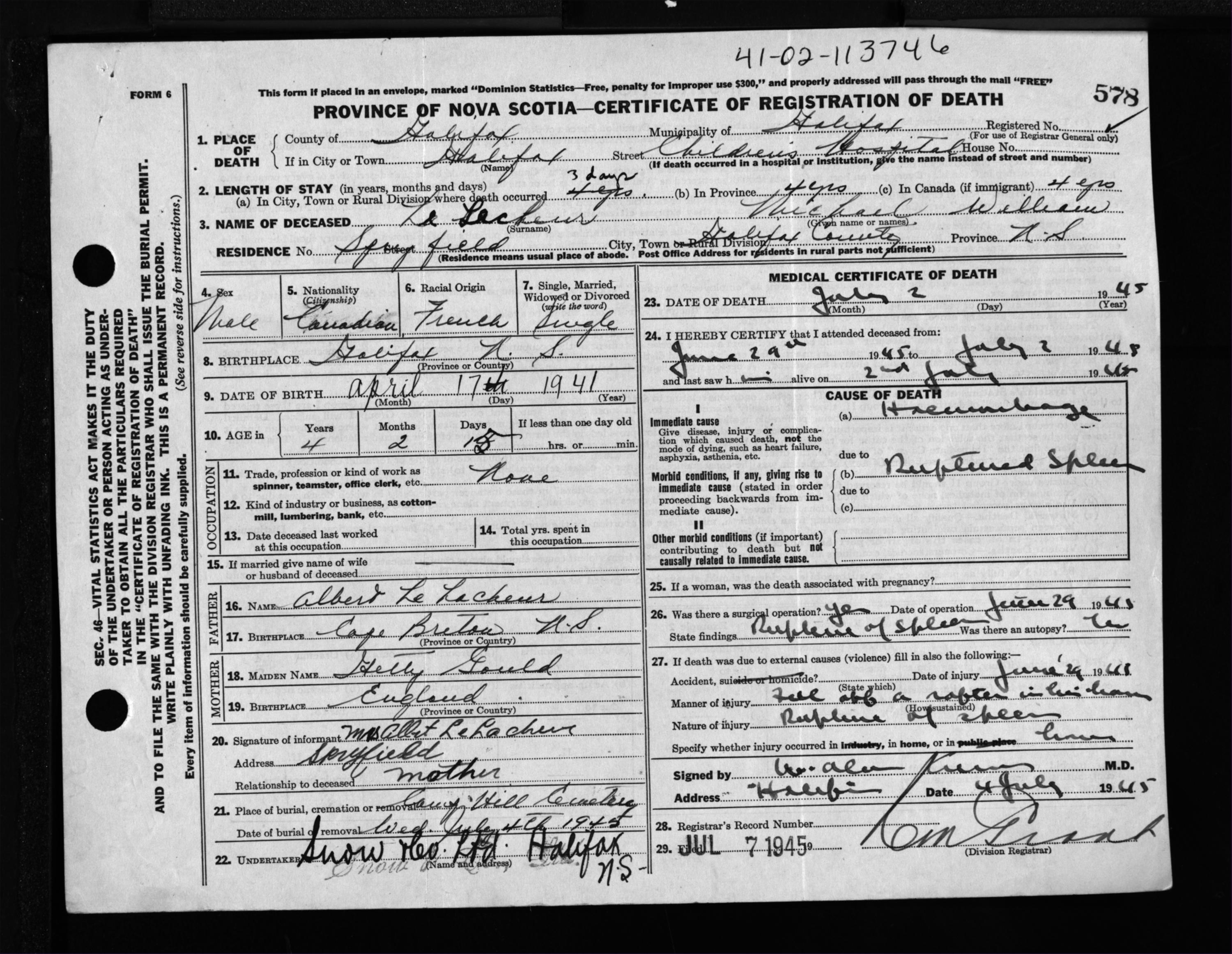 Male Death Registration: Year: 1945 file: 220 number: 578