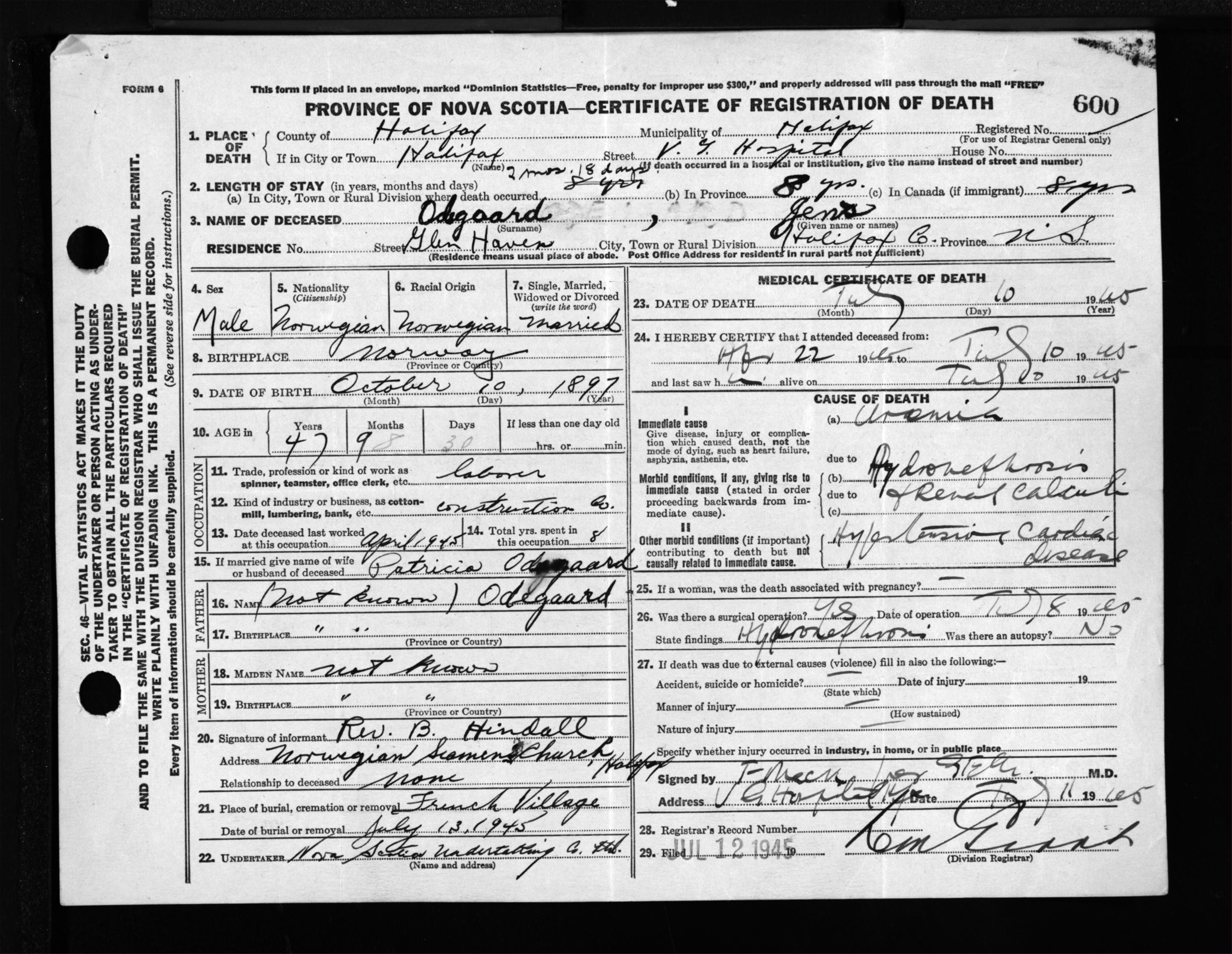 Male Death Registration: Year: 1945 file: 220 number: 600