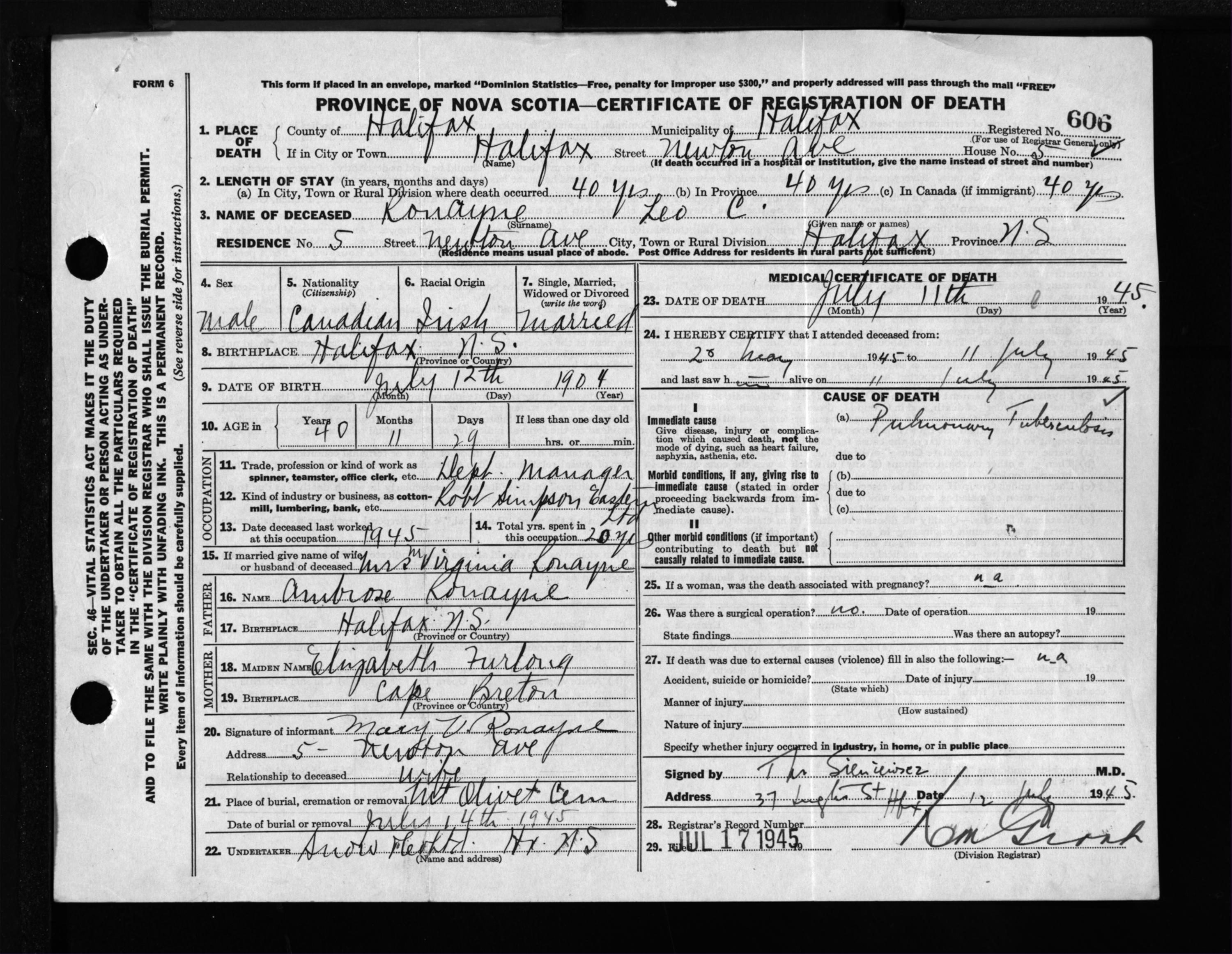 Male Death Registration: Year: 1945 file: 220 number: 606