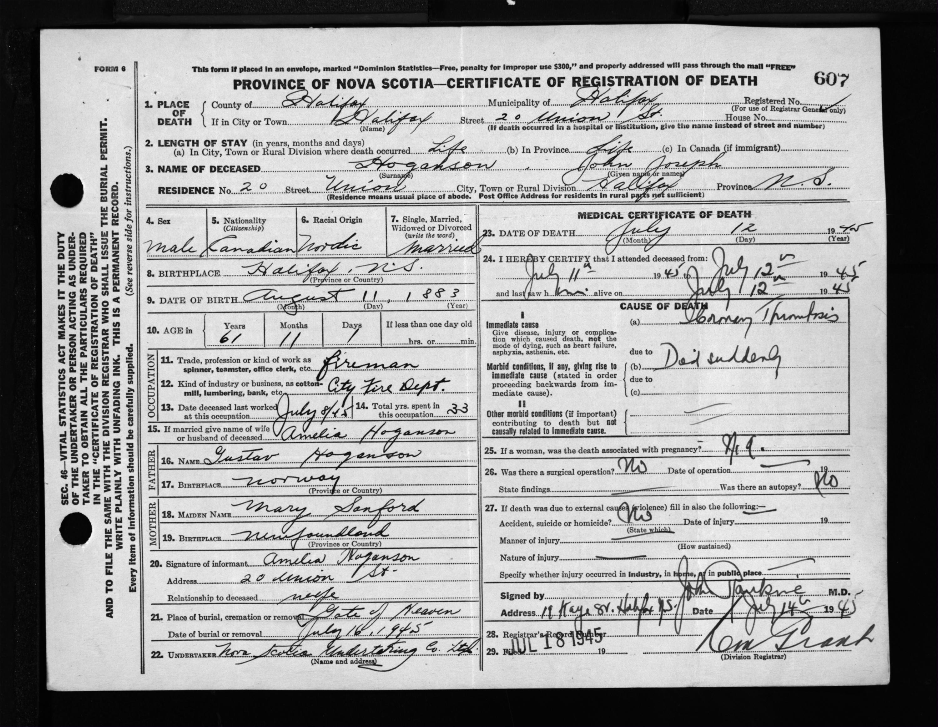 Male Death Registration: Year: 1945 file: 220 number: 607