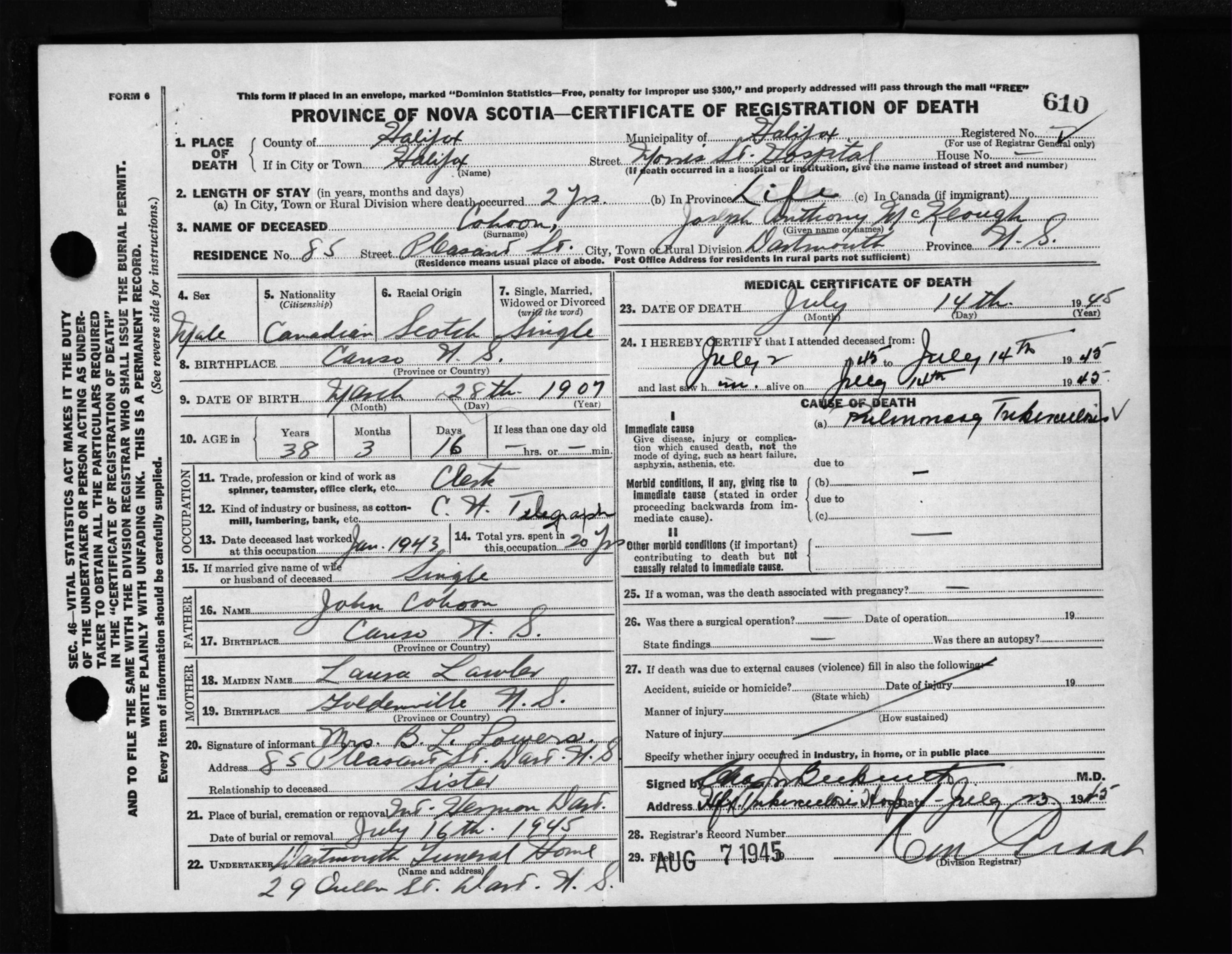 Male Death Registration: Year: 1945 file: 220 number: 610