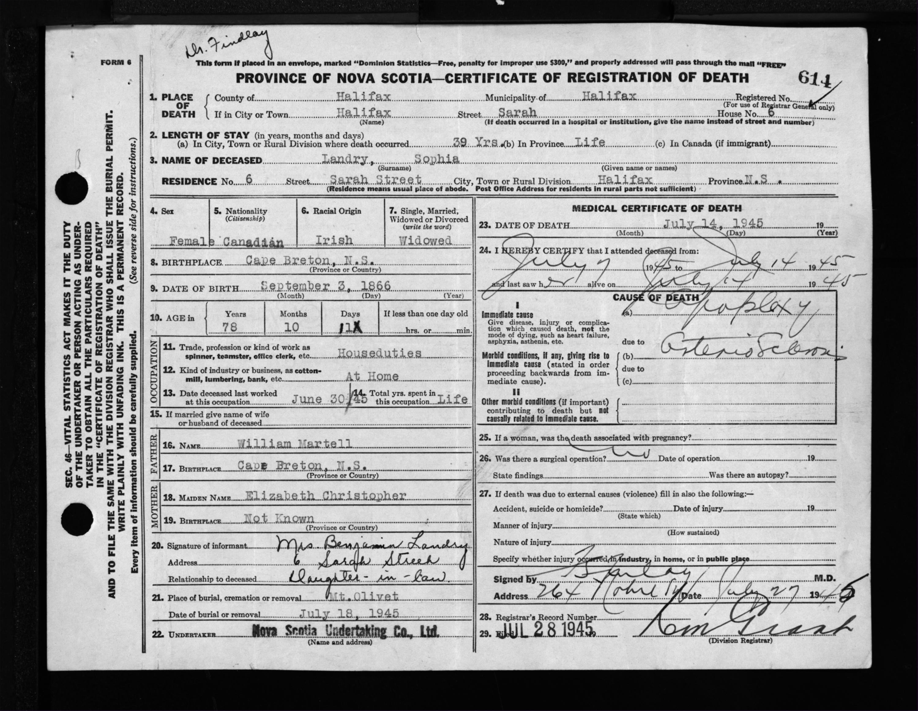 Female Death Registration: Year: 1945 file: 220 number: 614