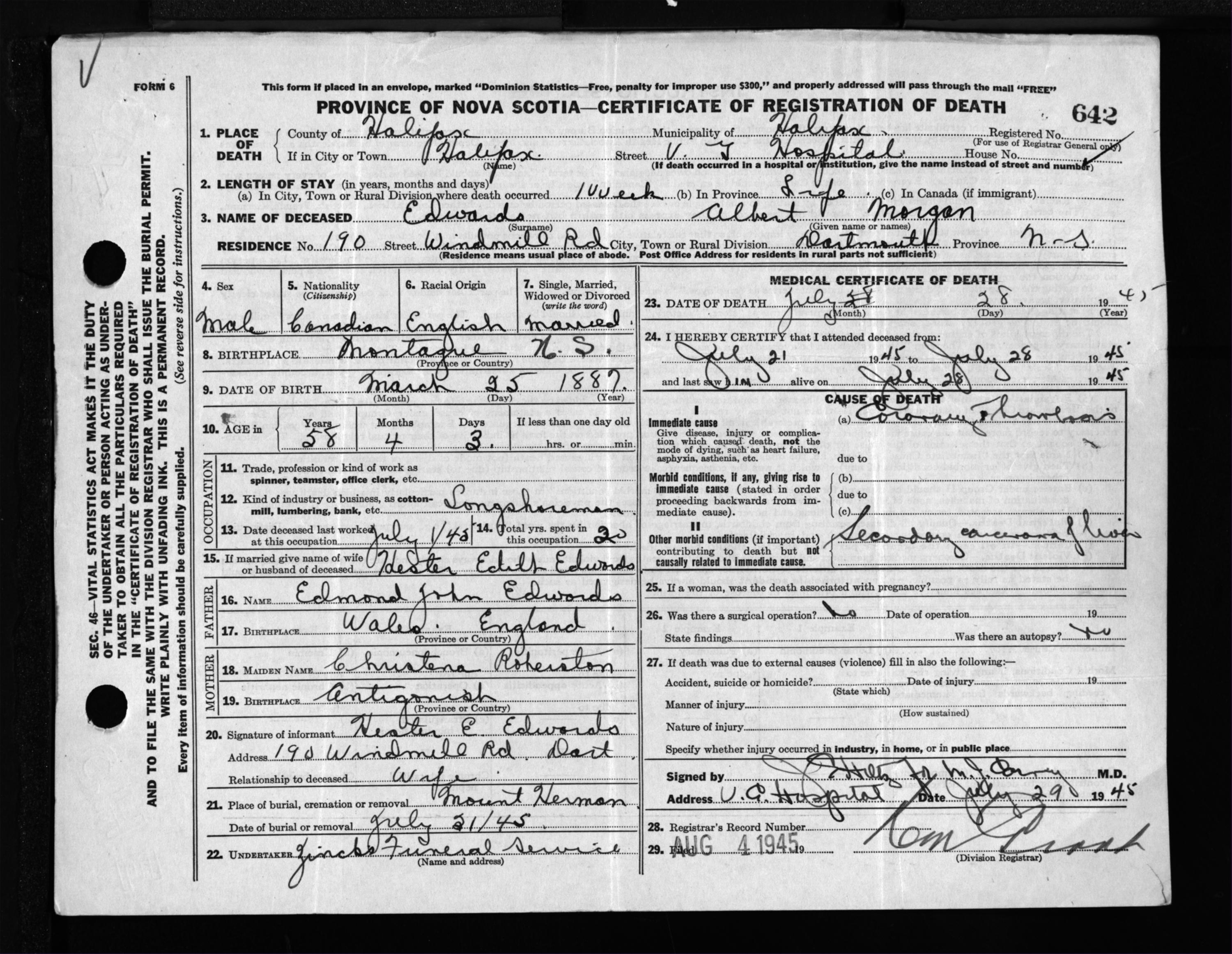 Male Death Registration: Year: 1945 file: 220 number: 642