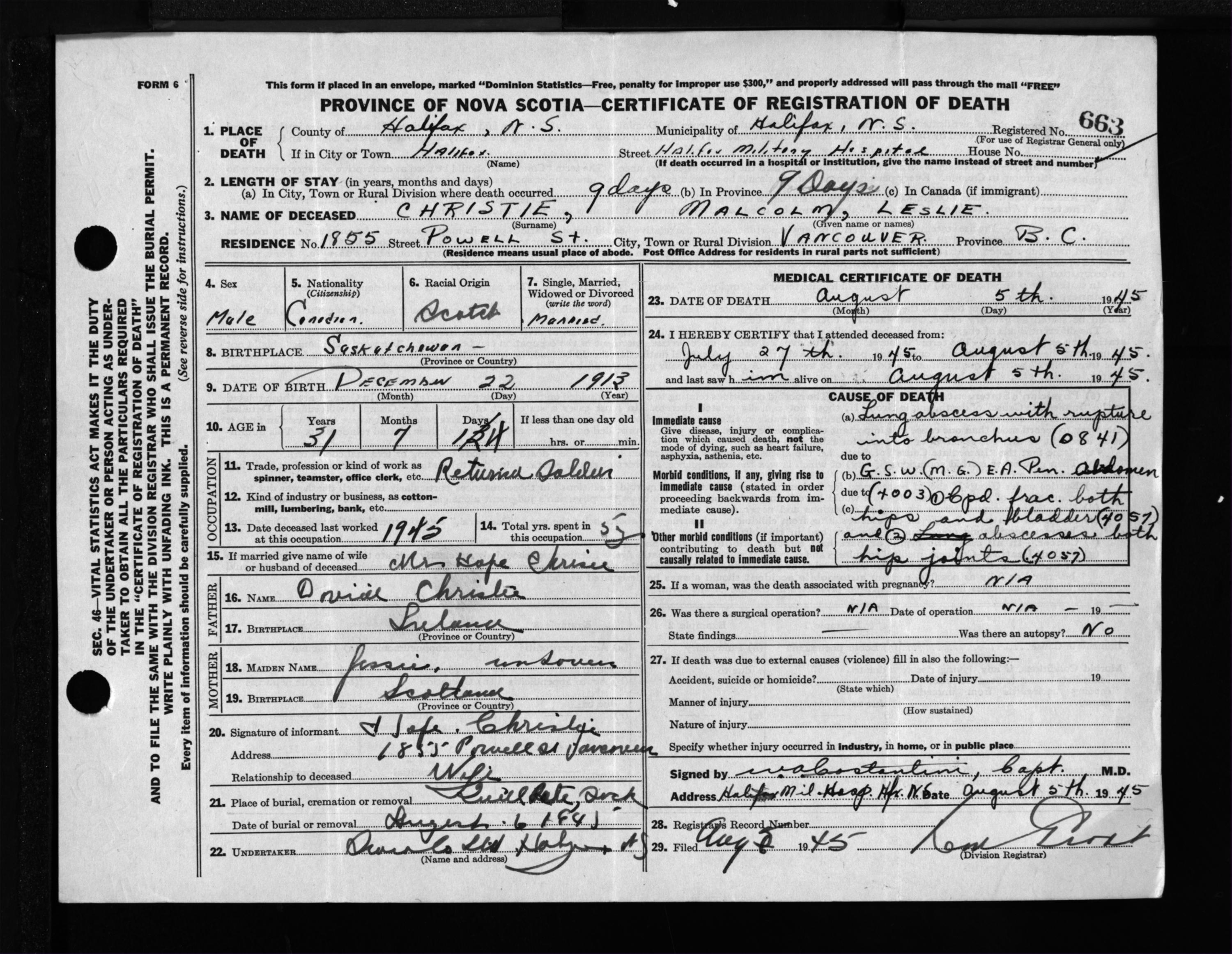 Male Death Registration: Year: 1945 file: 220 number: 663