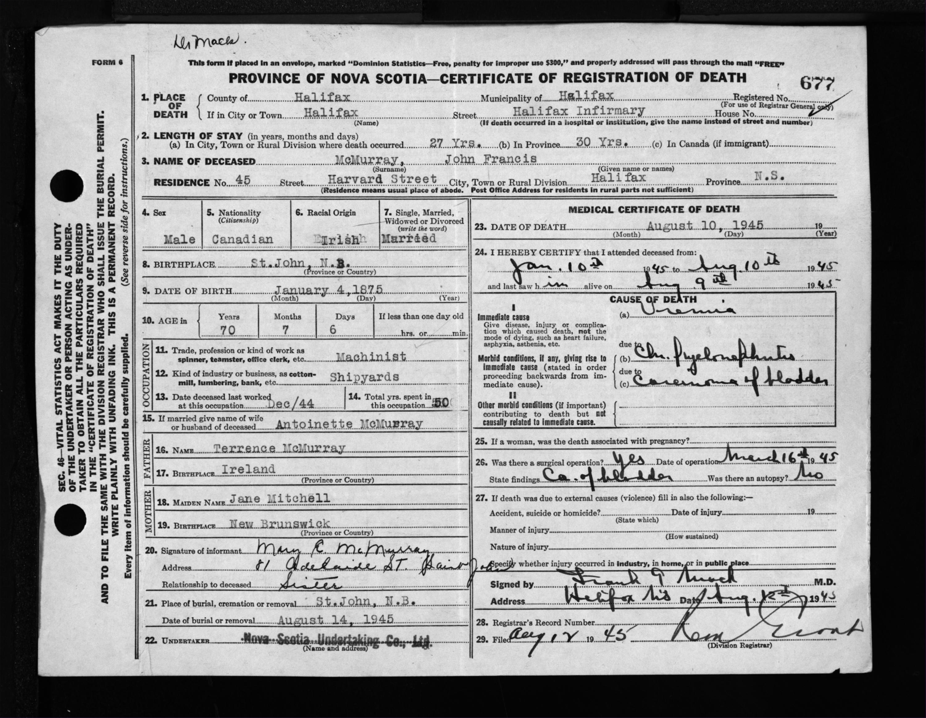 Male Death Registration: Year: 1945 file: 220 number: 677