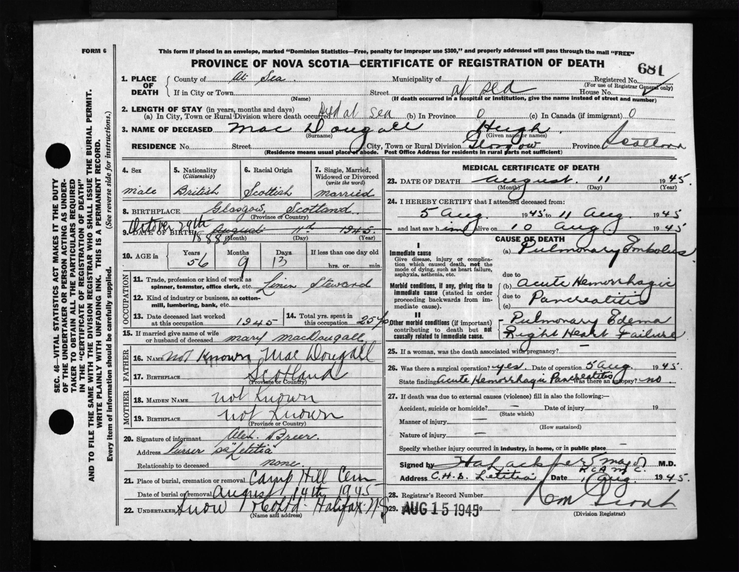 Male Death Registration: Year: 1945 file: 220 number: 681