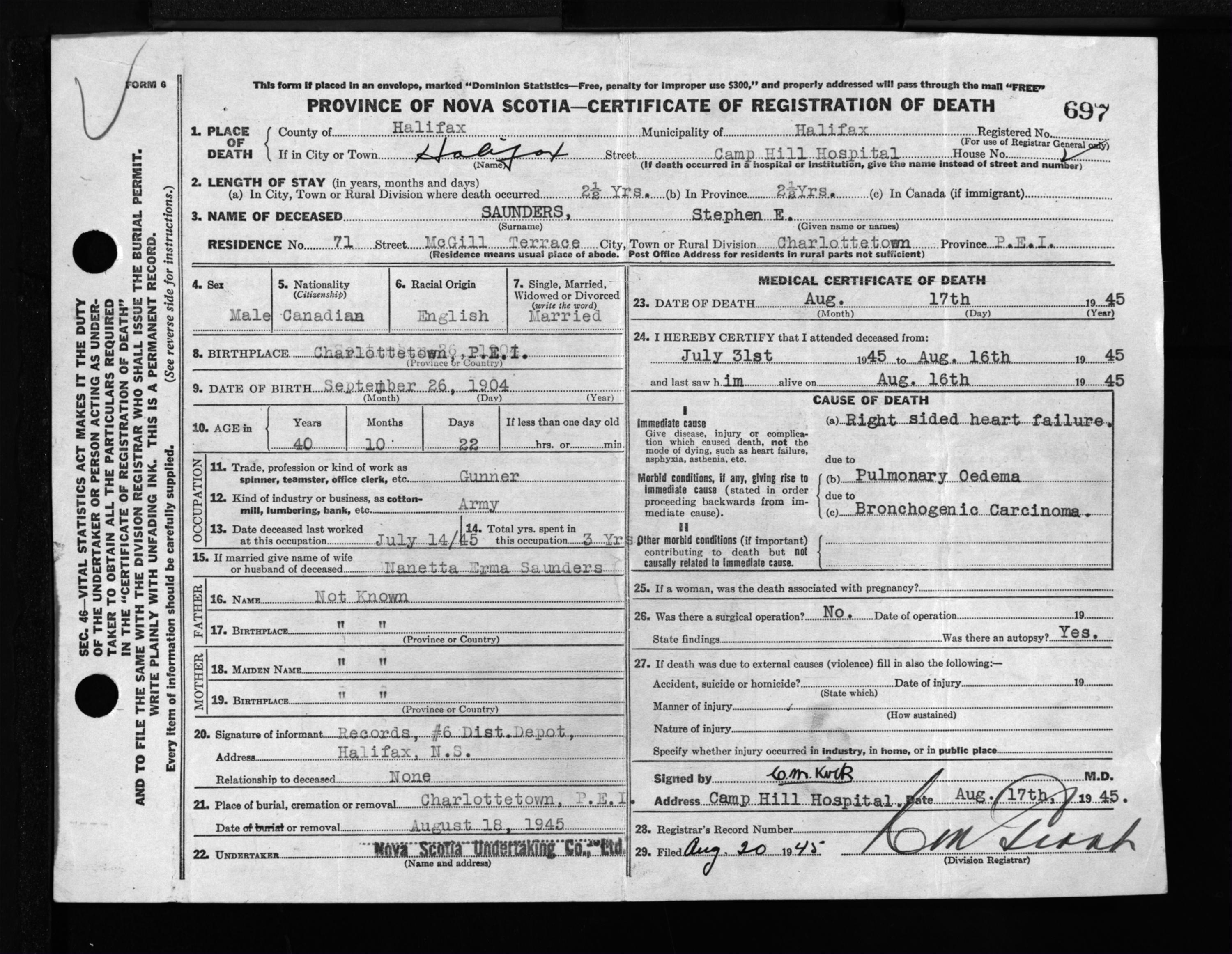 Male Death Registration: Year: 1945 file: 220 number: 697