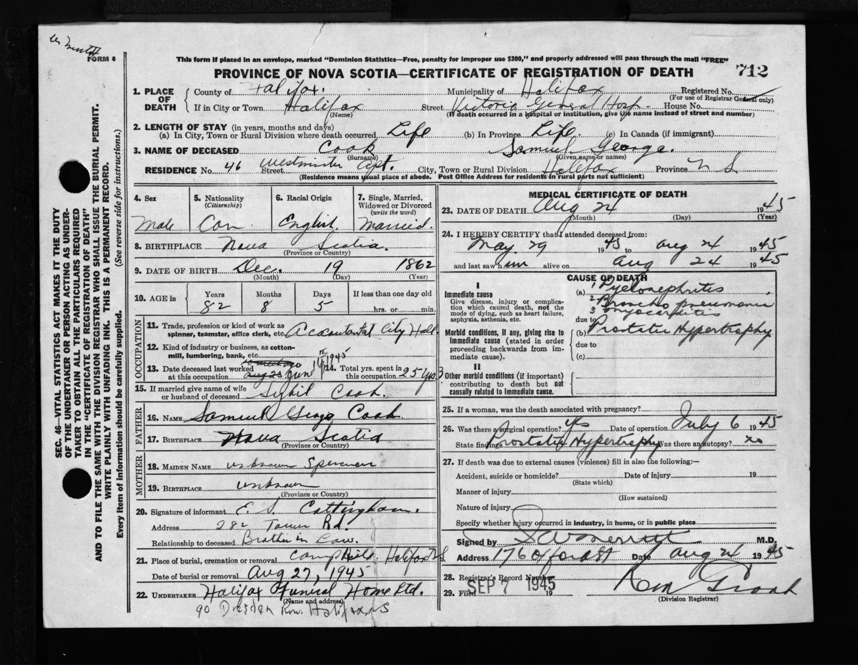 Death Registration: Year: 1945 file: 220 number: 712