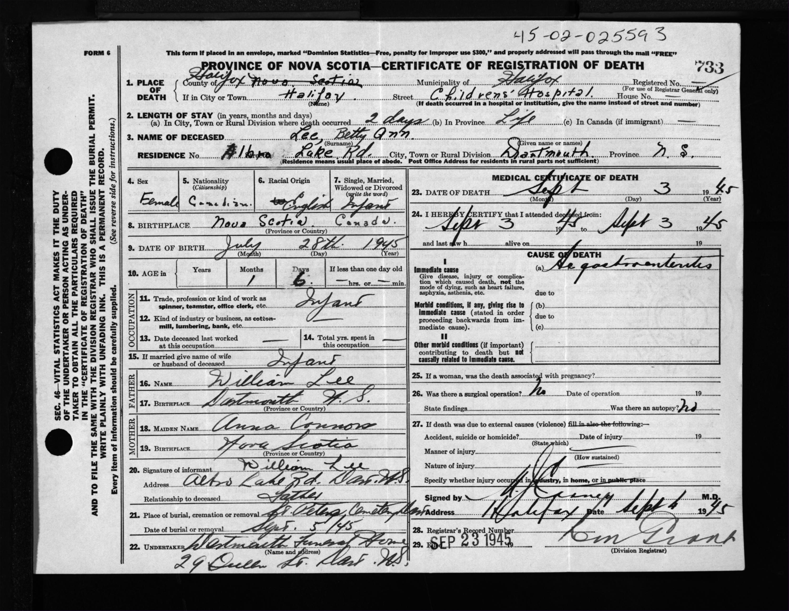 Death Registration: Year: 1945 file: 220 number: 733