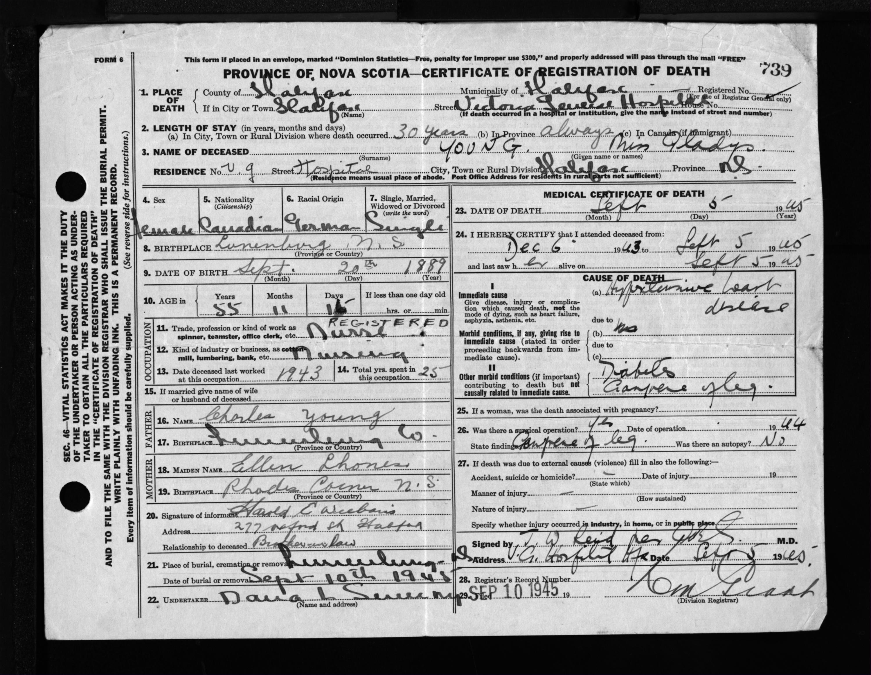 Death Registration: Year: 1945 file: 220 number: 739
